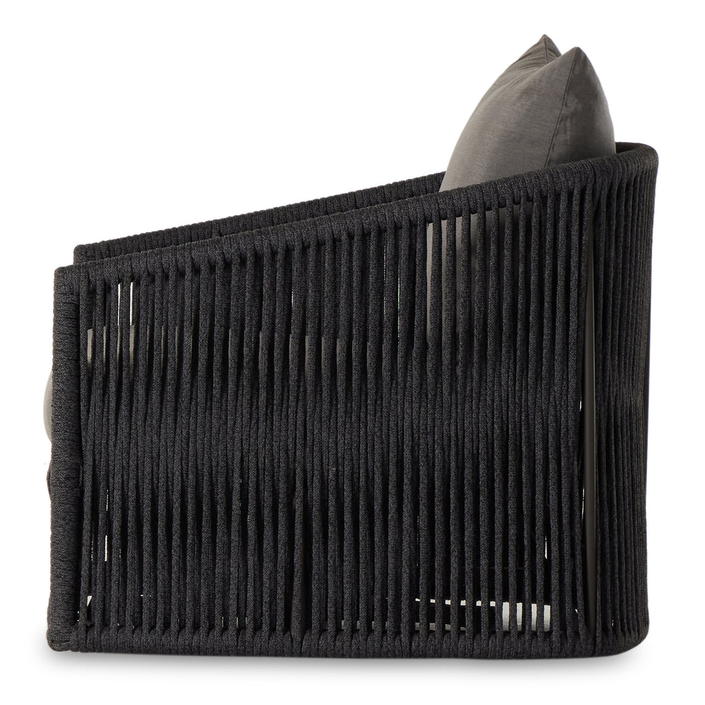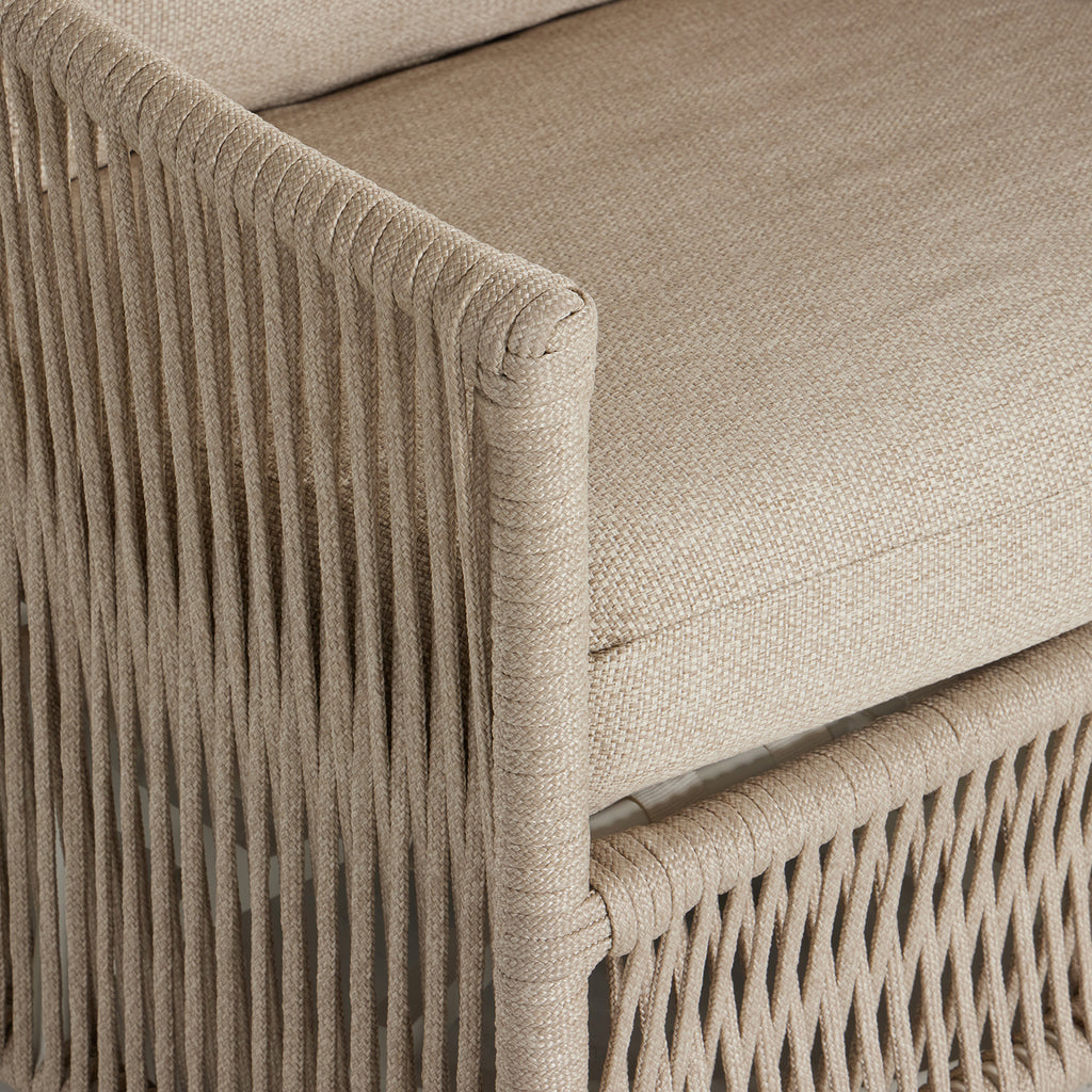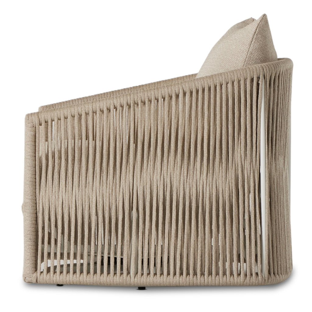 A beautiful rope-based design is woven across a durable, 360-swivel aluminum frame in a rich bronze finish. Topped with a wide cushion and throw pillow, all upholstered in 100% olefin, known for its UV-resistant, water-repellent and quick-drying abilities. Cover or store indoors during inclement weather and when not in use.