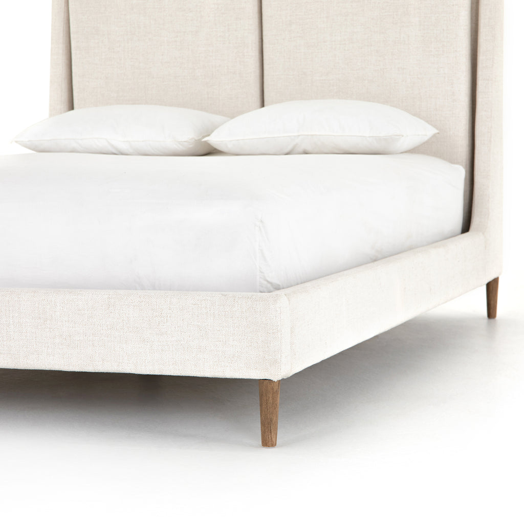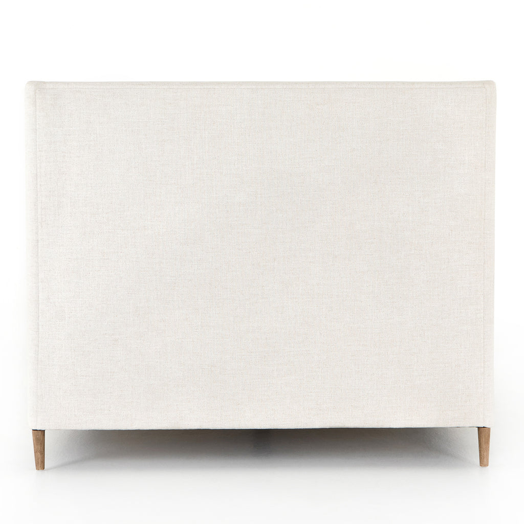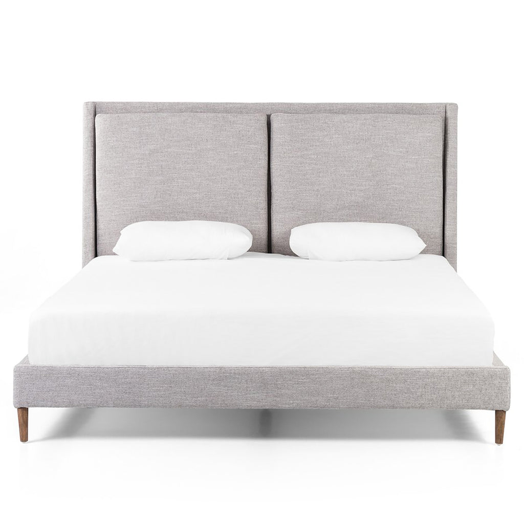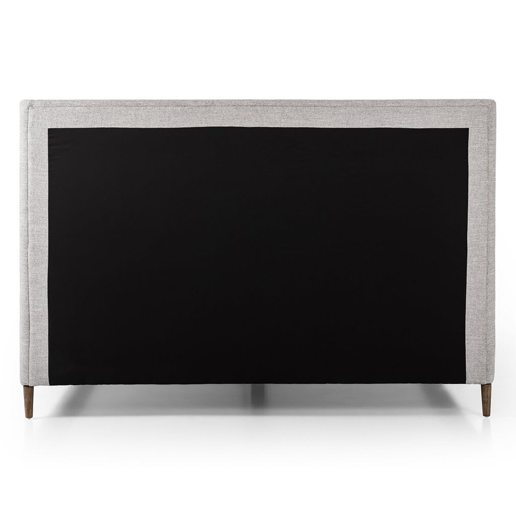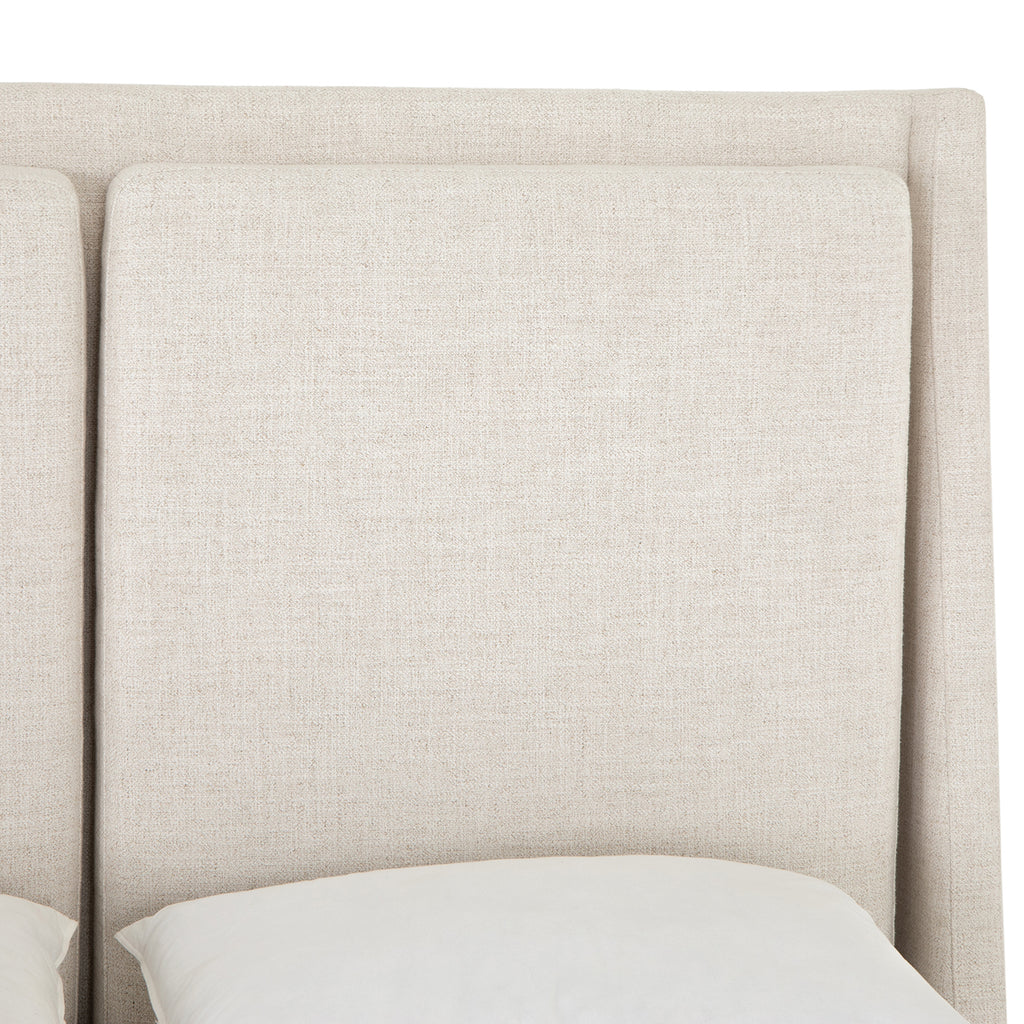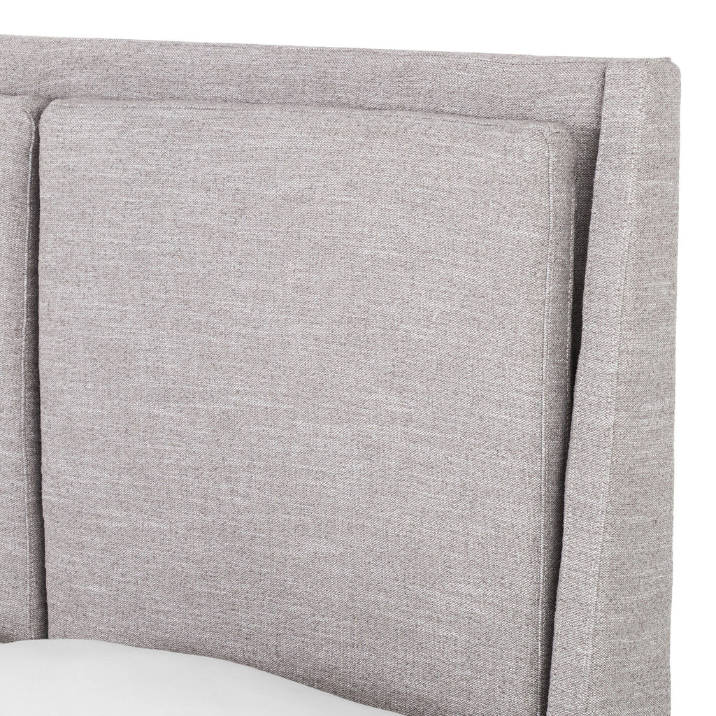Light, livable luxury. Upholstered in a cream or gray linen-blend, a tapered headboard features fixed overscale pillows, for a calming look with great depth. Wire-brushed parawood legs lend a warm, natural finishing touch.