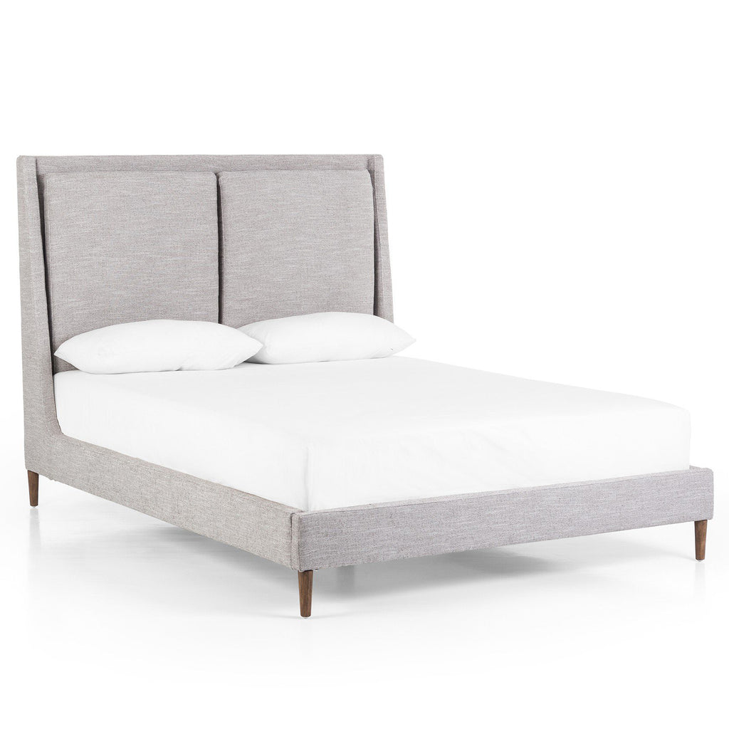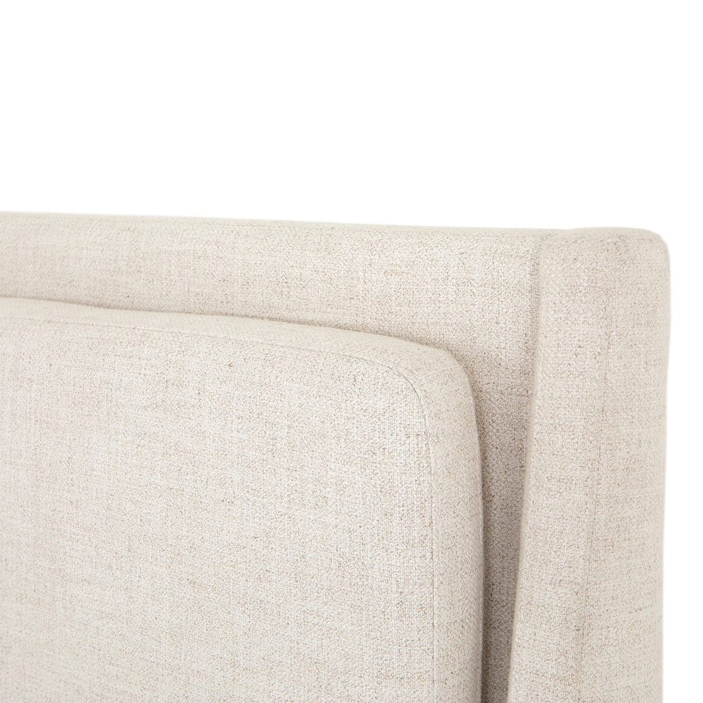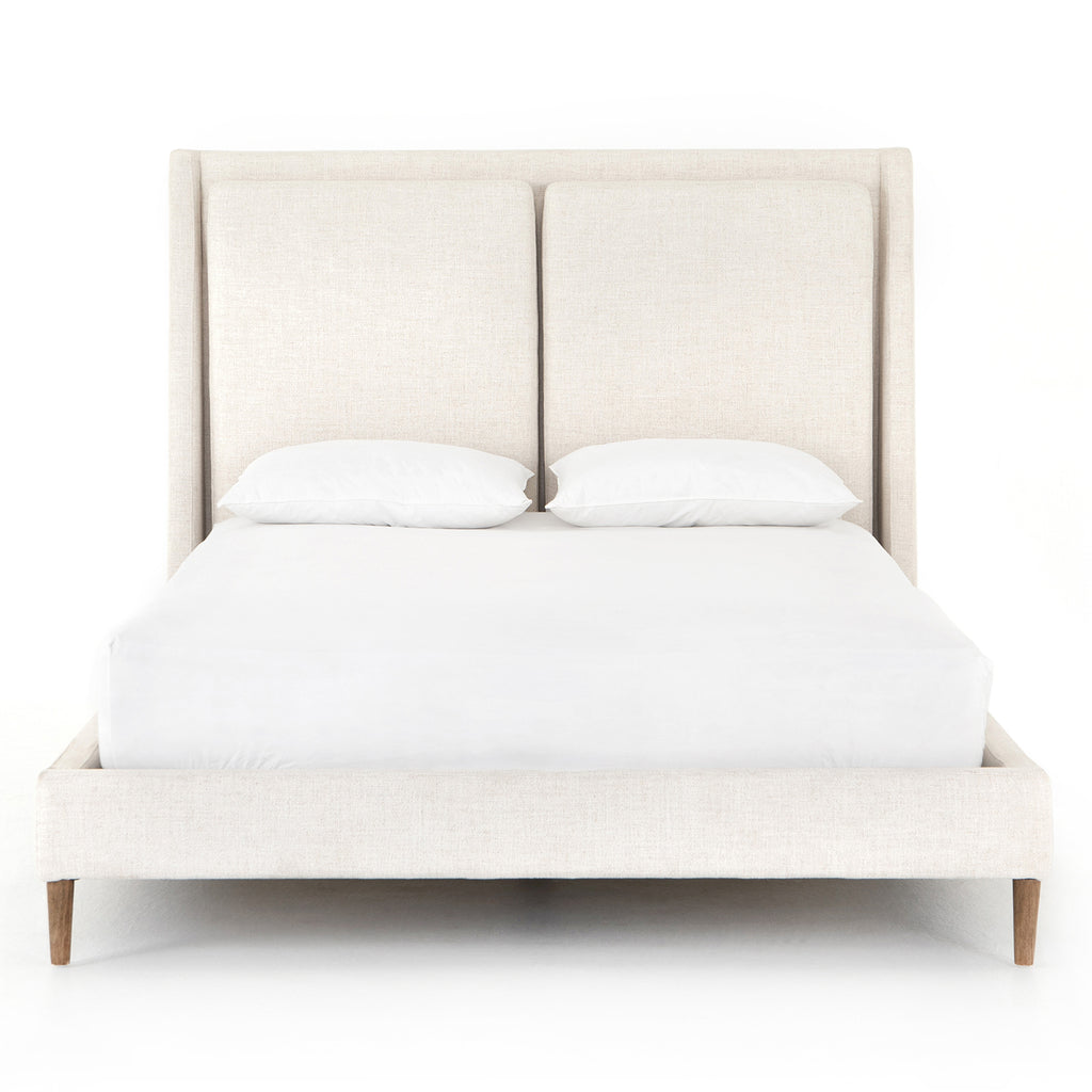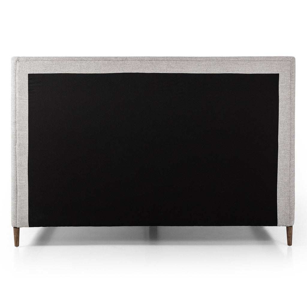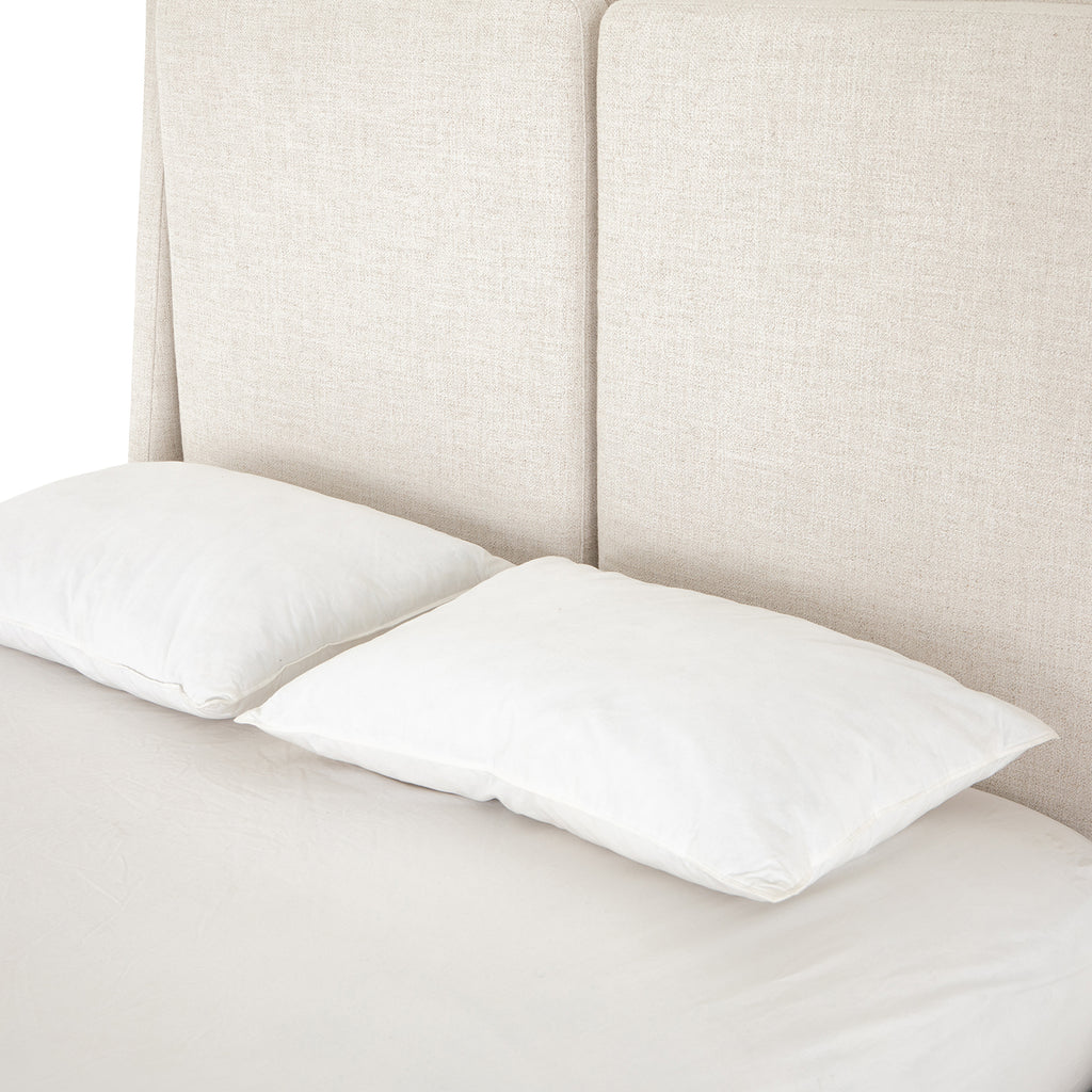 Light, livable luxury. Upholstered in a cream or gray linen-blend, a tapered headboard features fixed overscale pillows, for a calming look with great depth. Wire-brushed parawood legs lend a warm, natural finishing touch.