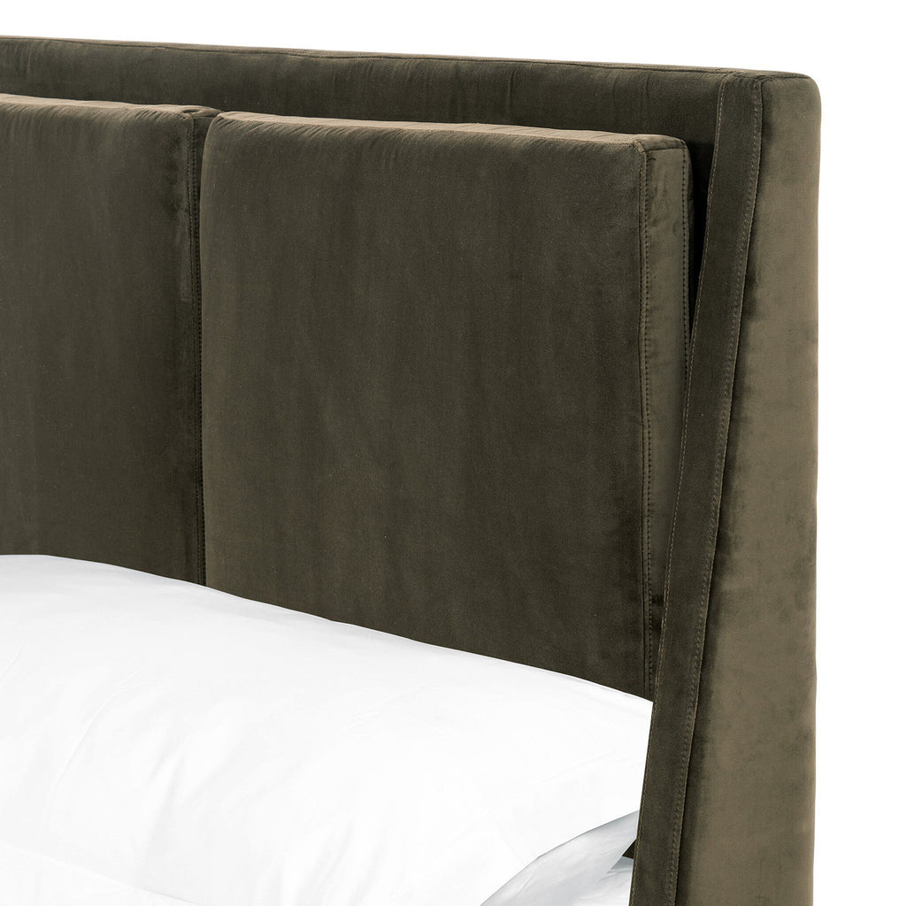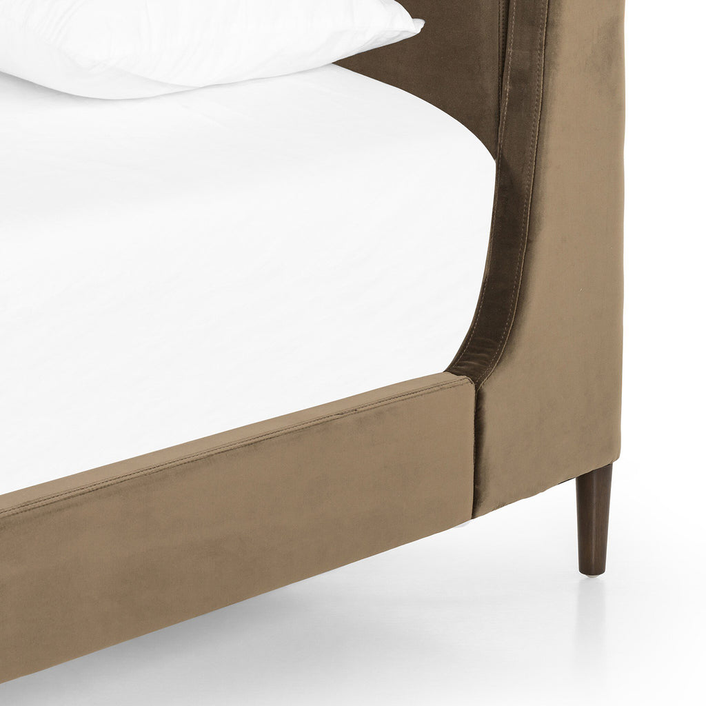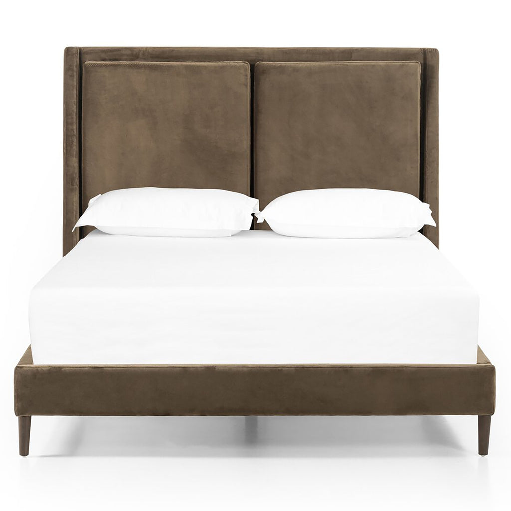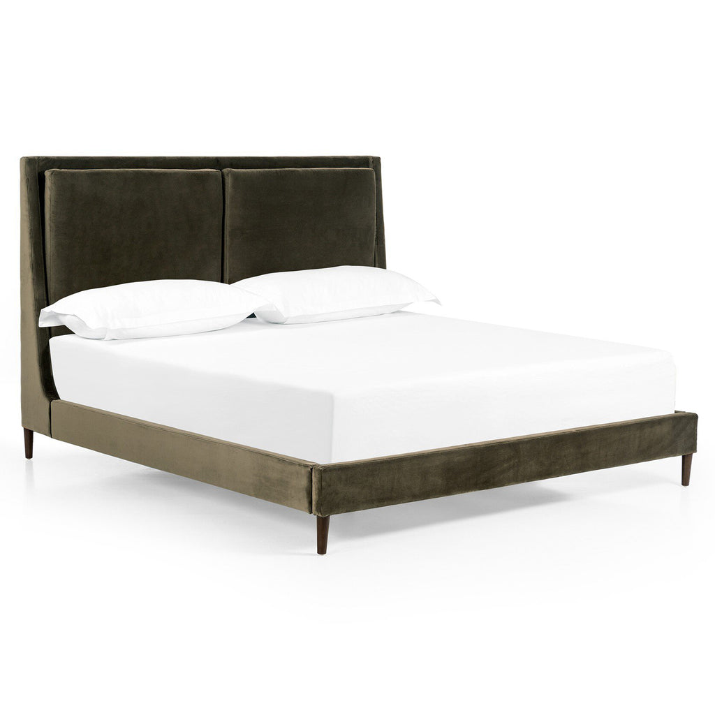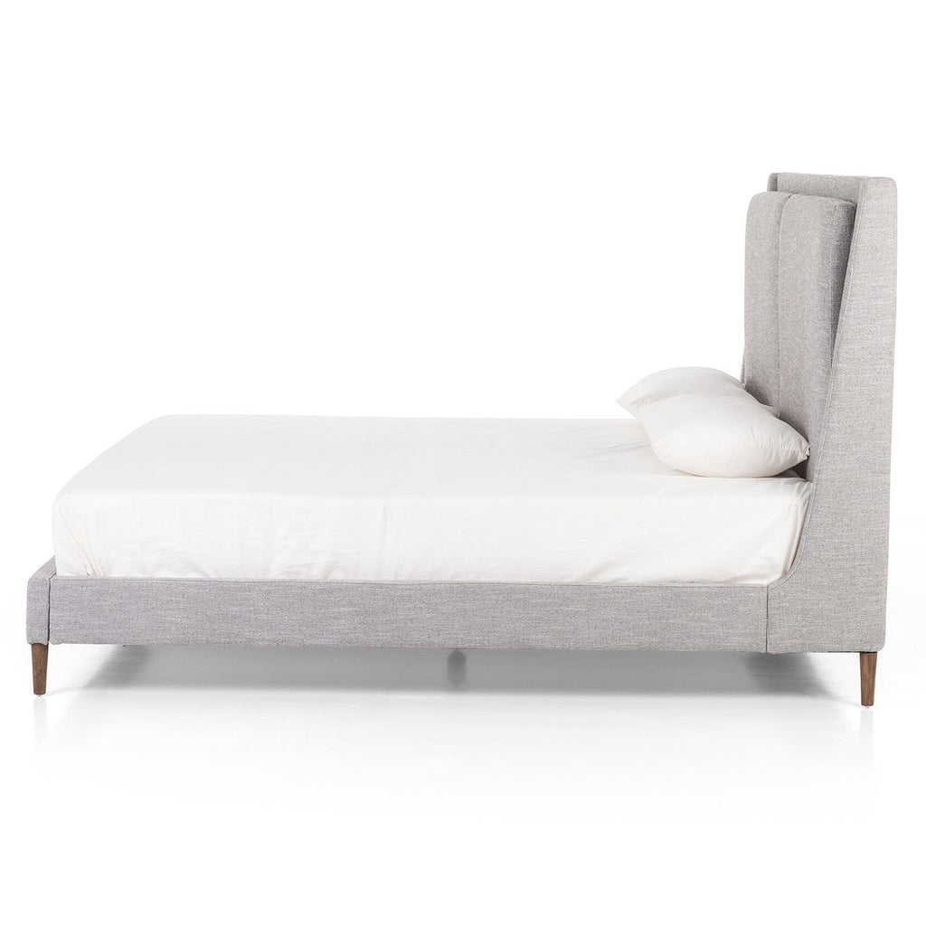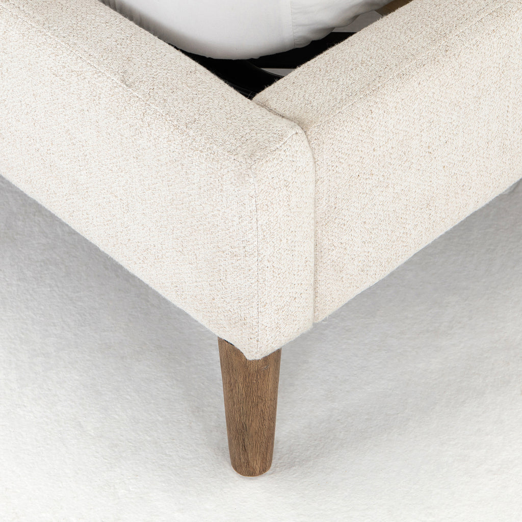 Light, livable luxury. Upholstered in a cream or gray linen-blend, a tapered headboard features fixed overscale pillows, for a calming look with great depth. Wire-brushed parawood legs lend a warm, natural finishing touch.