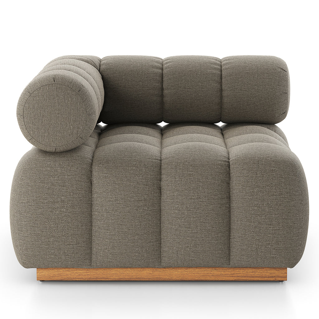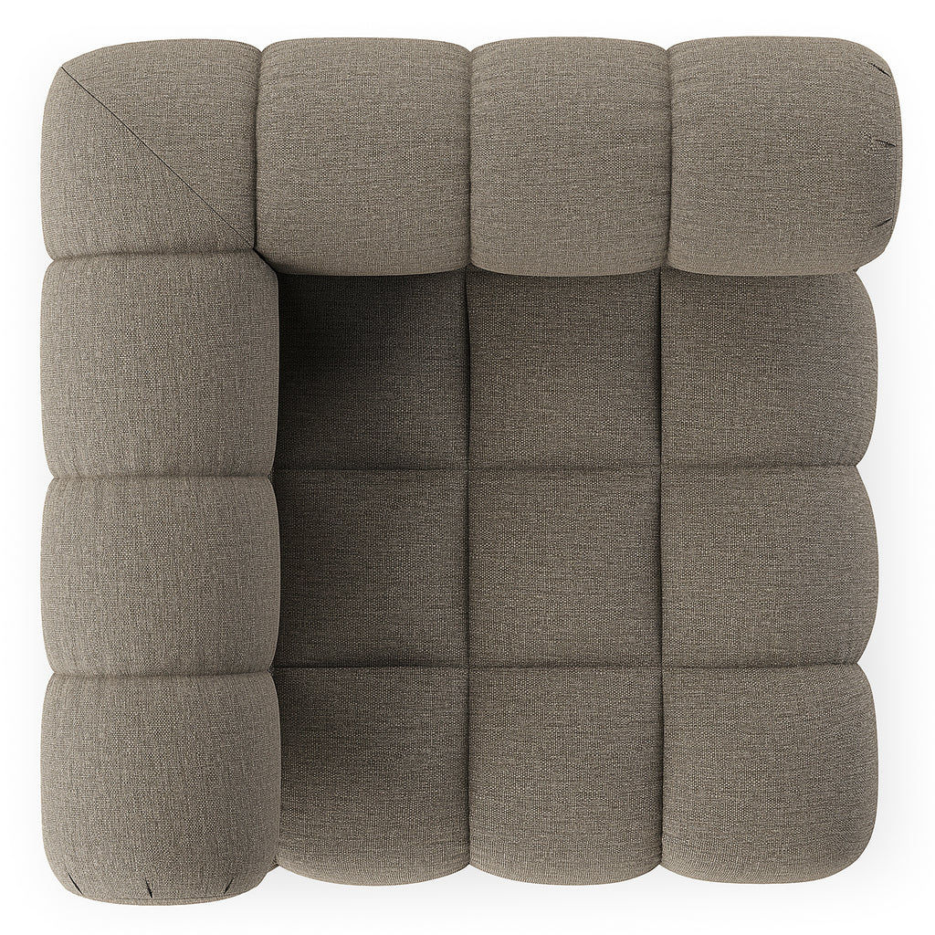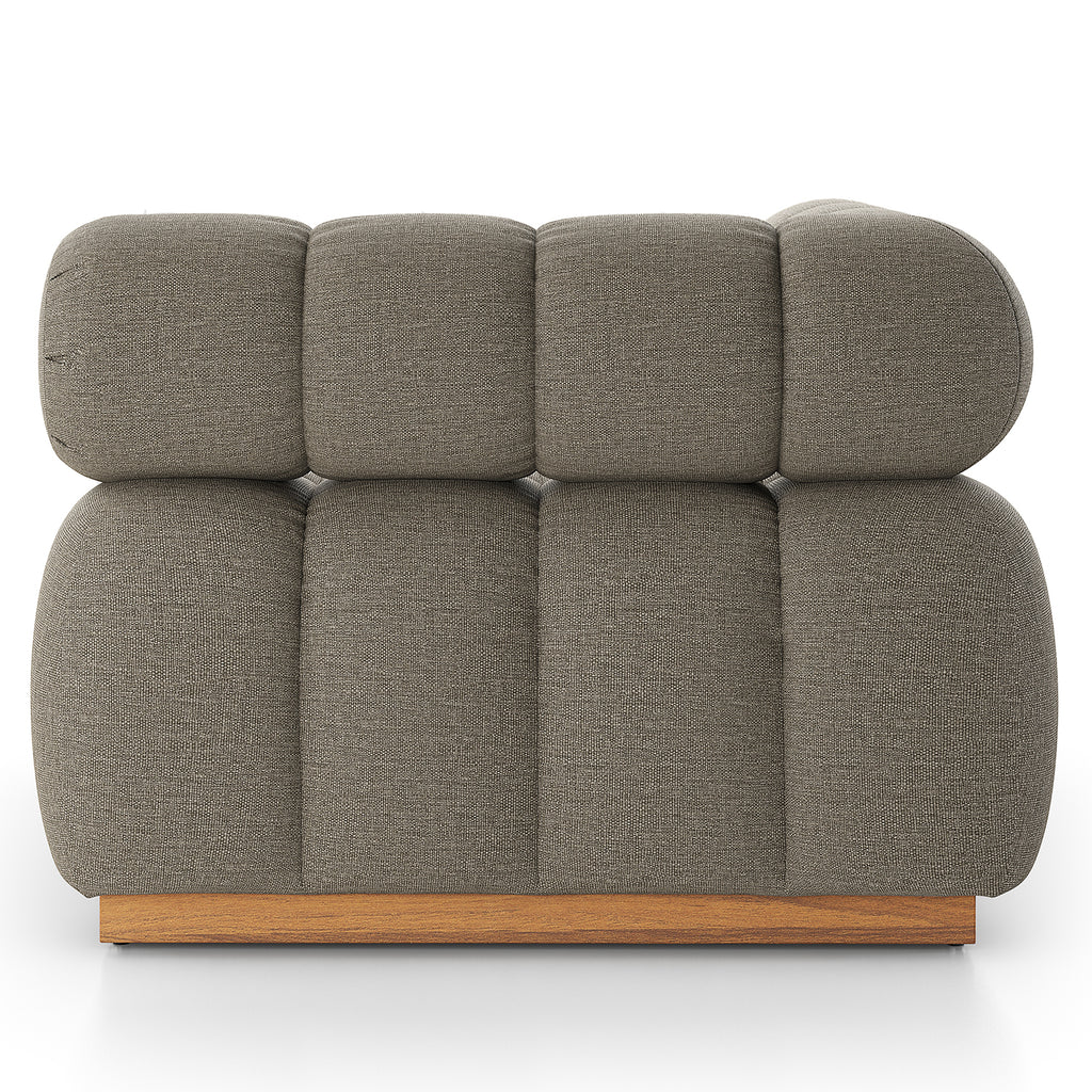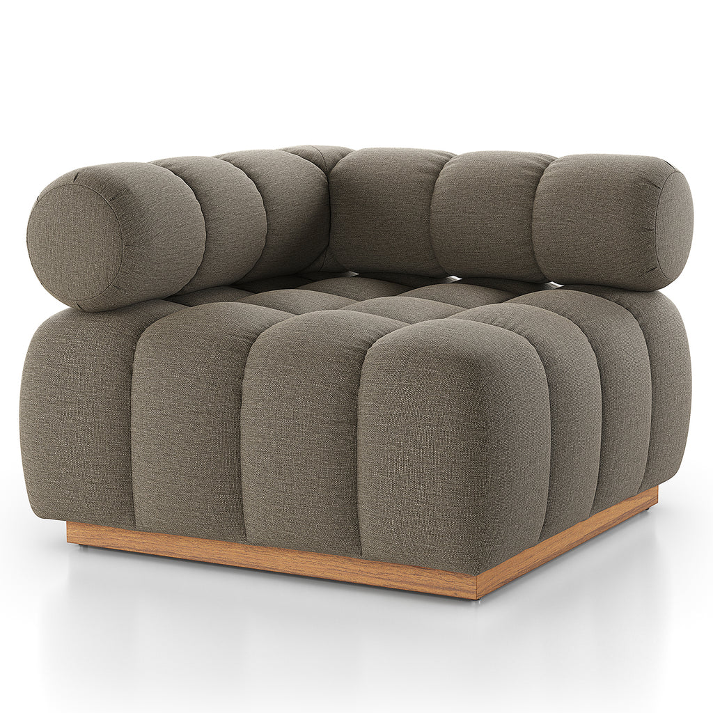 A modern take on mid-century Italian design, soft volume and exaggerated proportions fuse for a sculpted look and playful feel. Atop a plinth-style teak base, outdoor-friendly seating features dramatic tufting for a padded sit, indoors and out. Armless piece to matching sectional. Sustainably made with zero waste, luxurious Italian upholstery places a new and unique spin on indoor/outdoor seating, offering soft, durable fabric that's highly resistant to sun, stains, mold and abrasion. Cover or store indoors during inclement weather and when not in use.