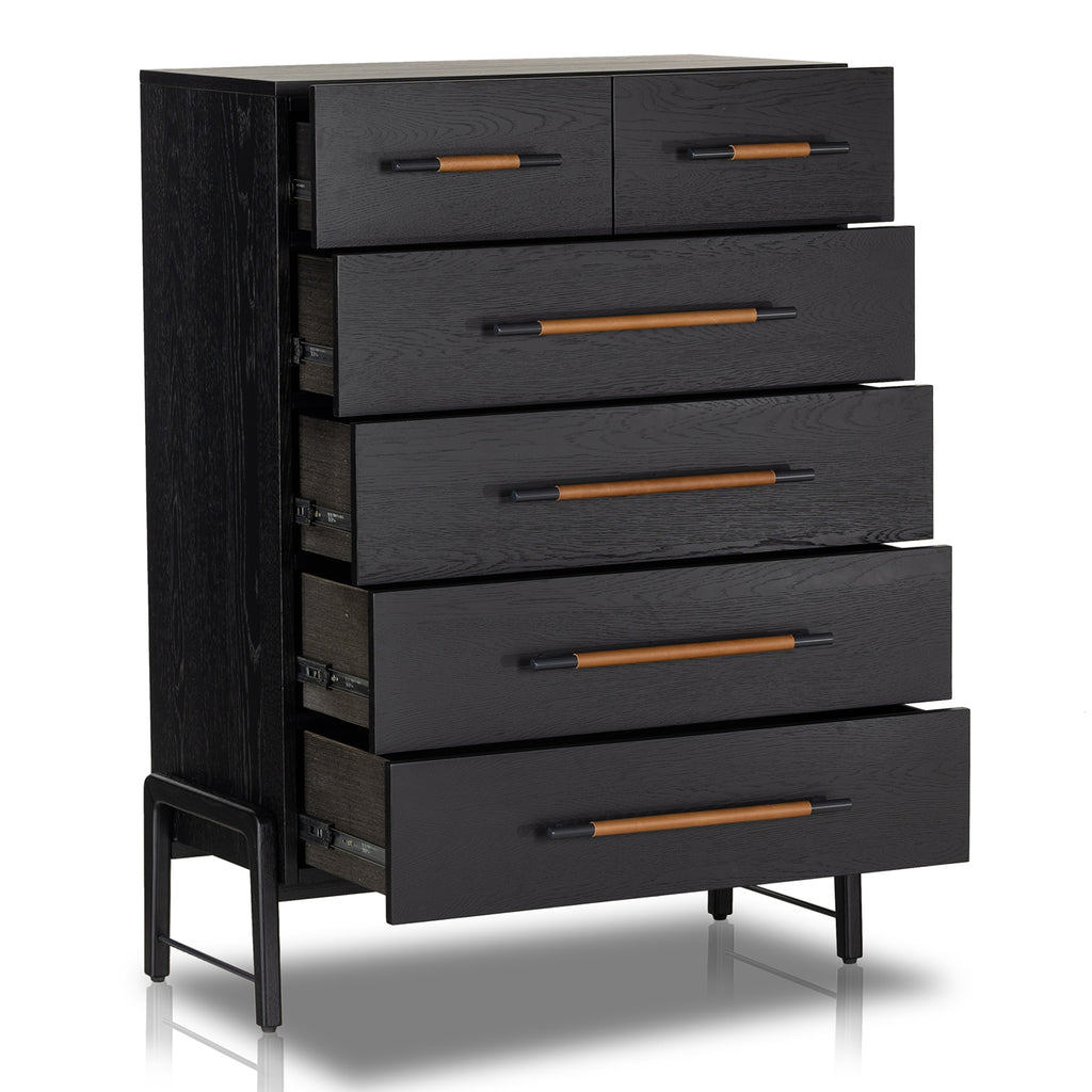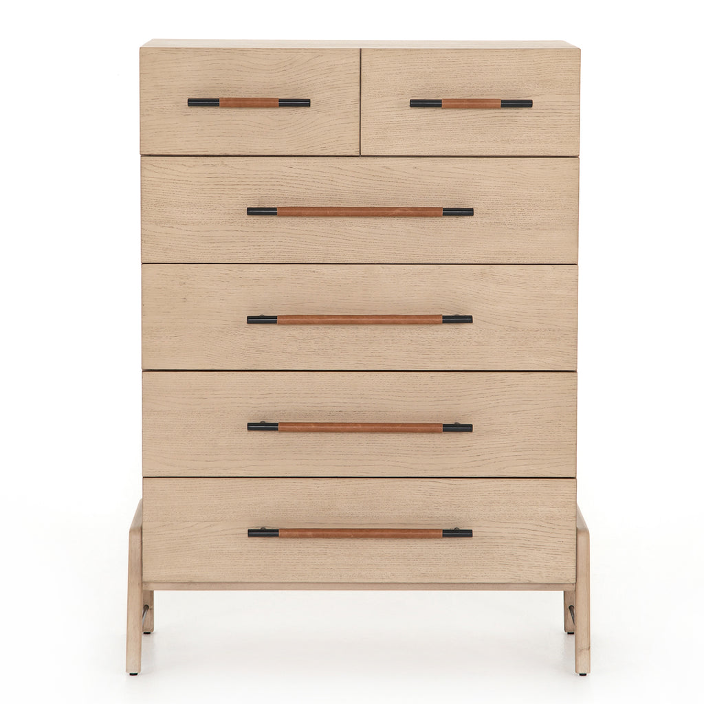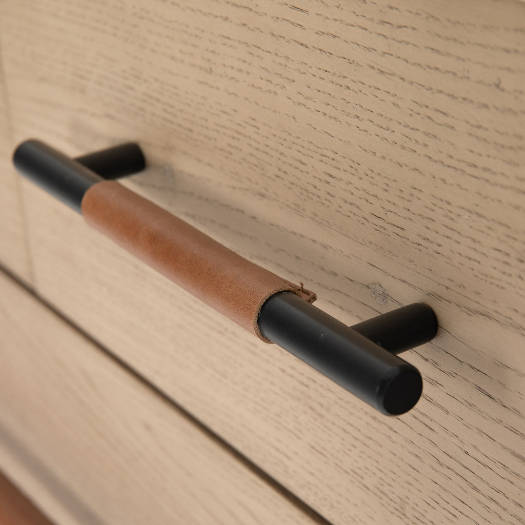 Oak forms a clean silhouette for six spacious drawers with iron hardware wrapped in tan top-grain leather.