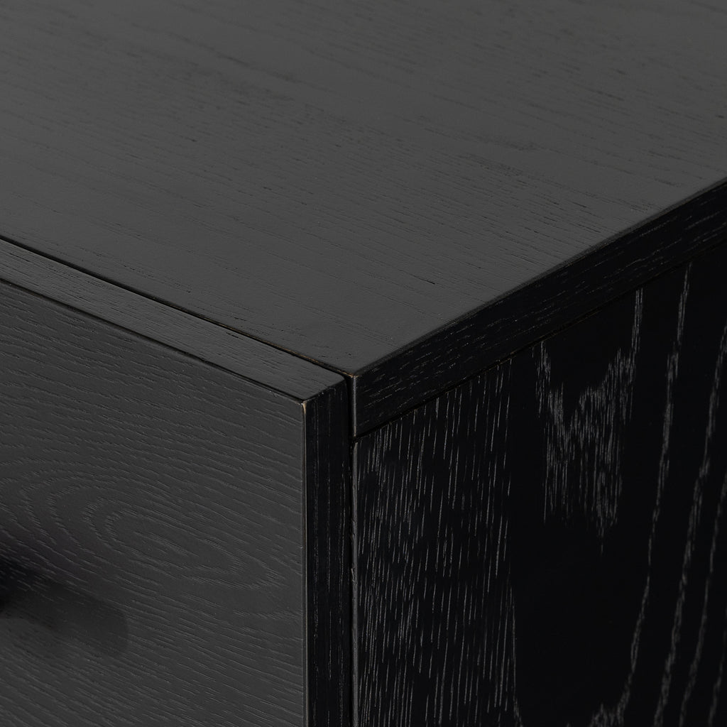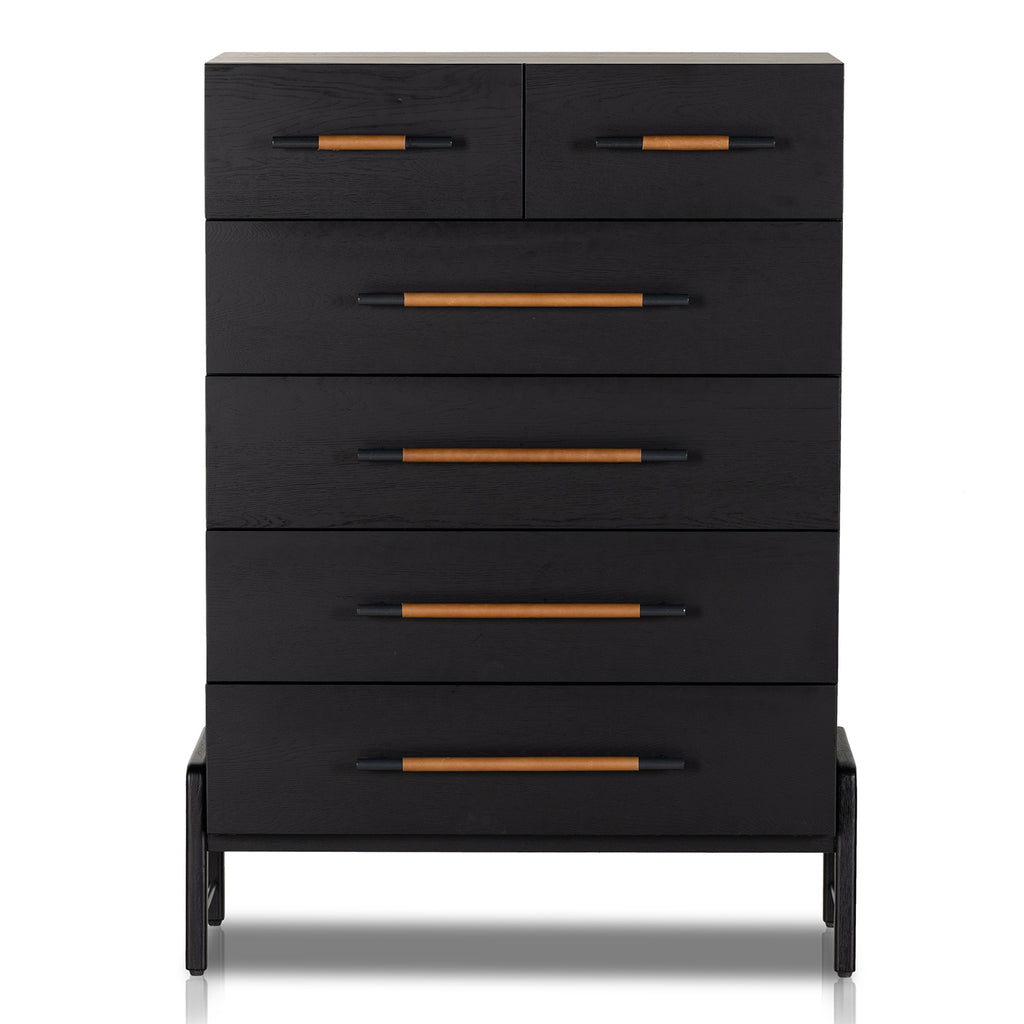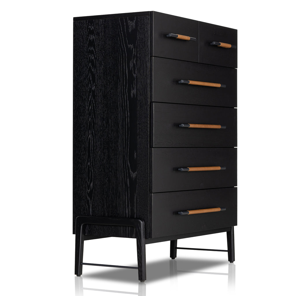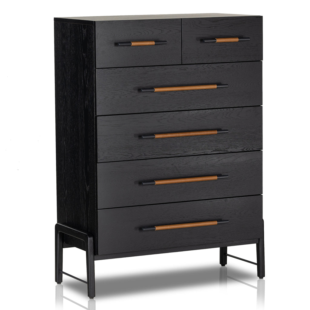 Oak forms a clean silhouette for six spacious drawers with iron hardware wrapped in tan top-grain leather.