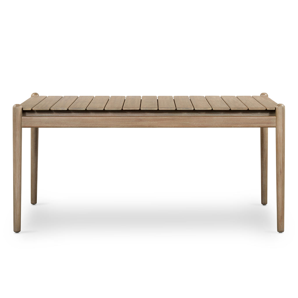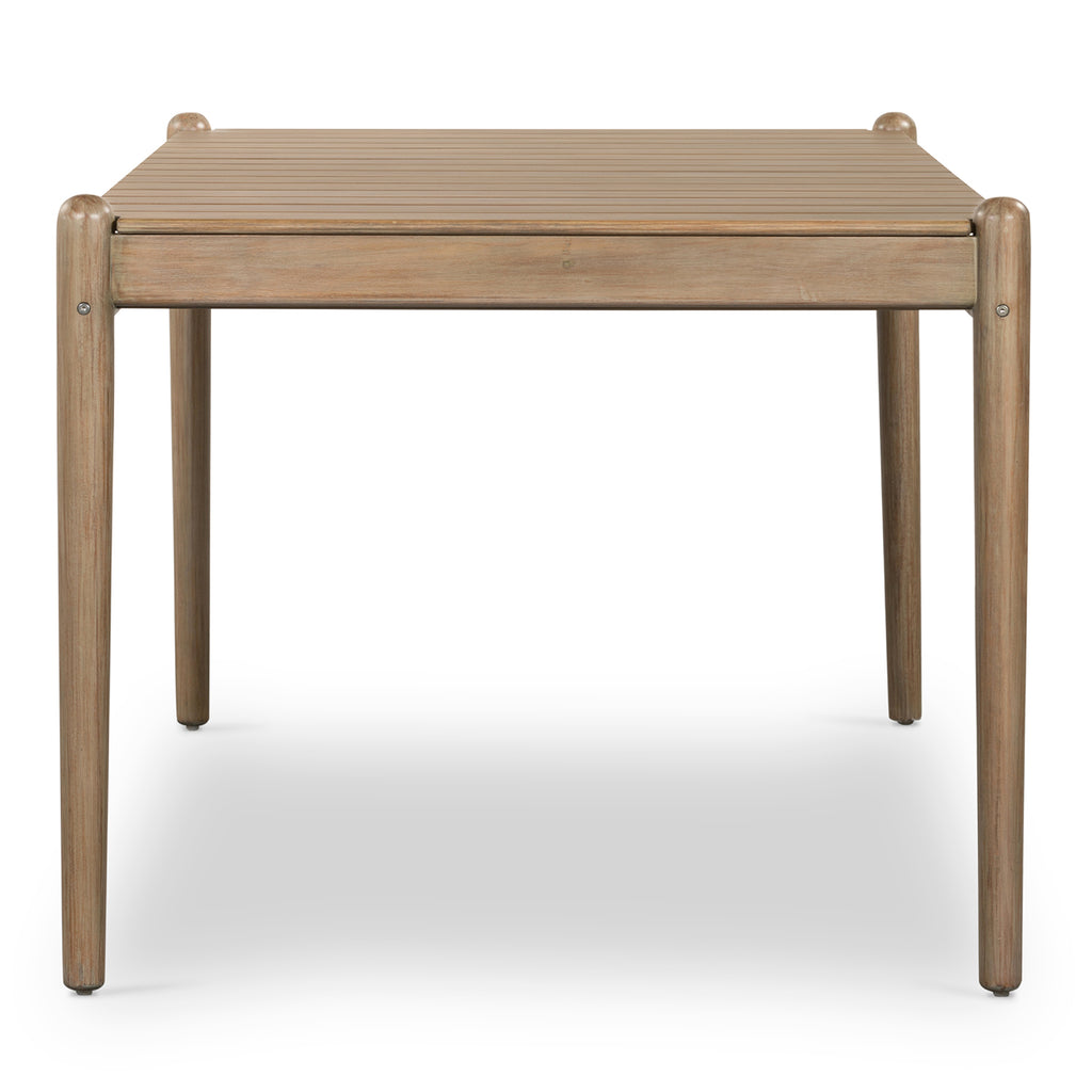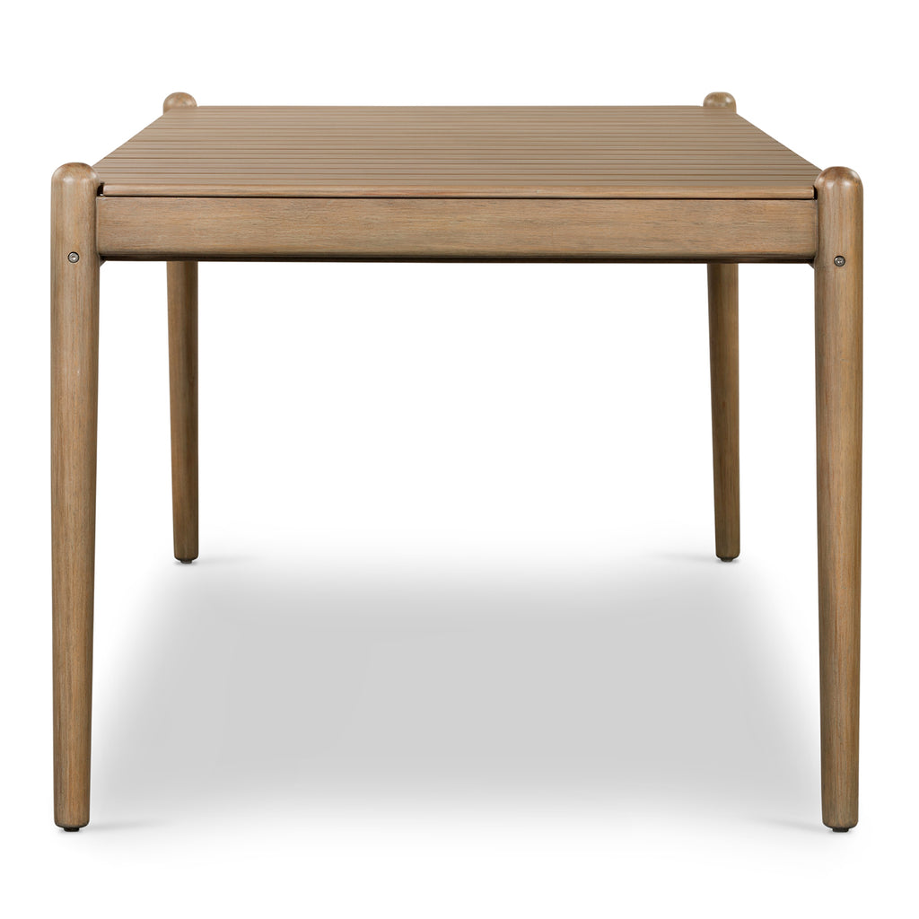 Made with FSC-certified eucalyptus, a rectangular, slatted dining table presents the perfect gathering place for intimate outdoor entertaining. Visible through the top, tapered leg detailing adds a unique touch. Cover or store inside during inclement weather and when not in use.