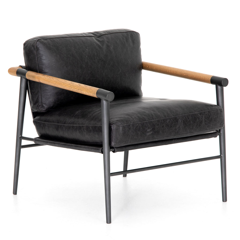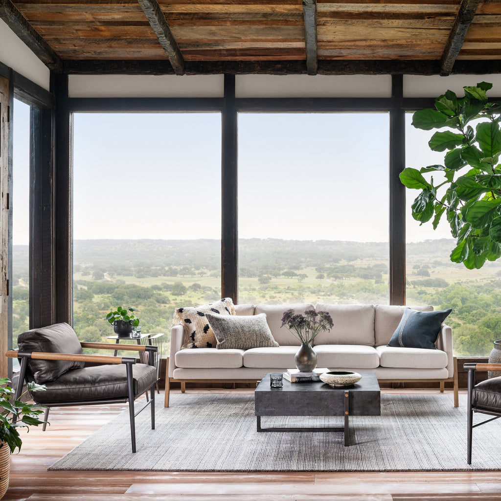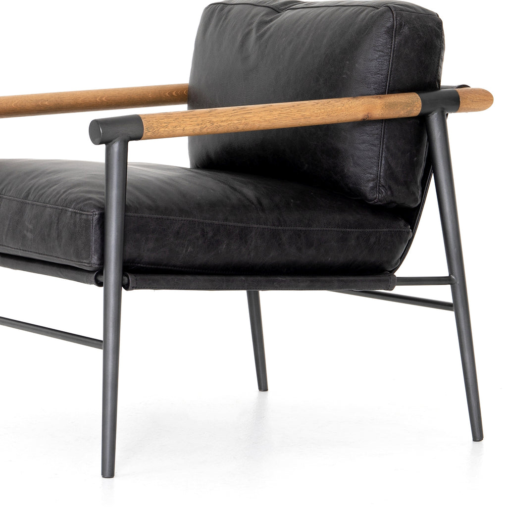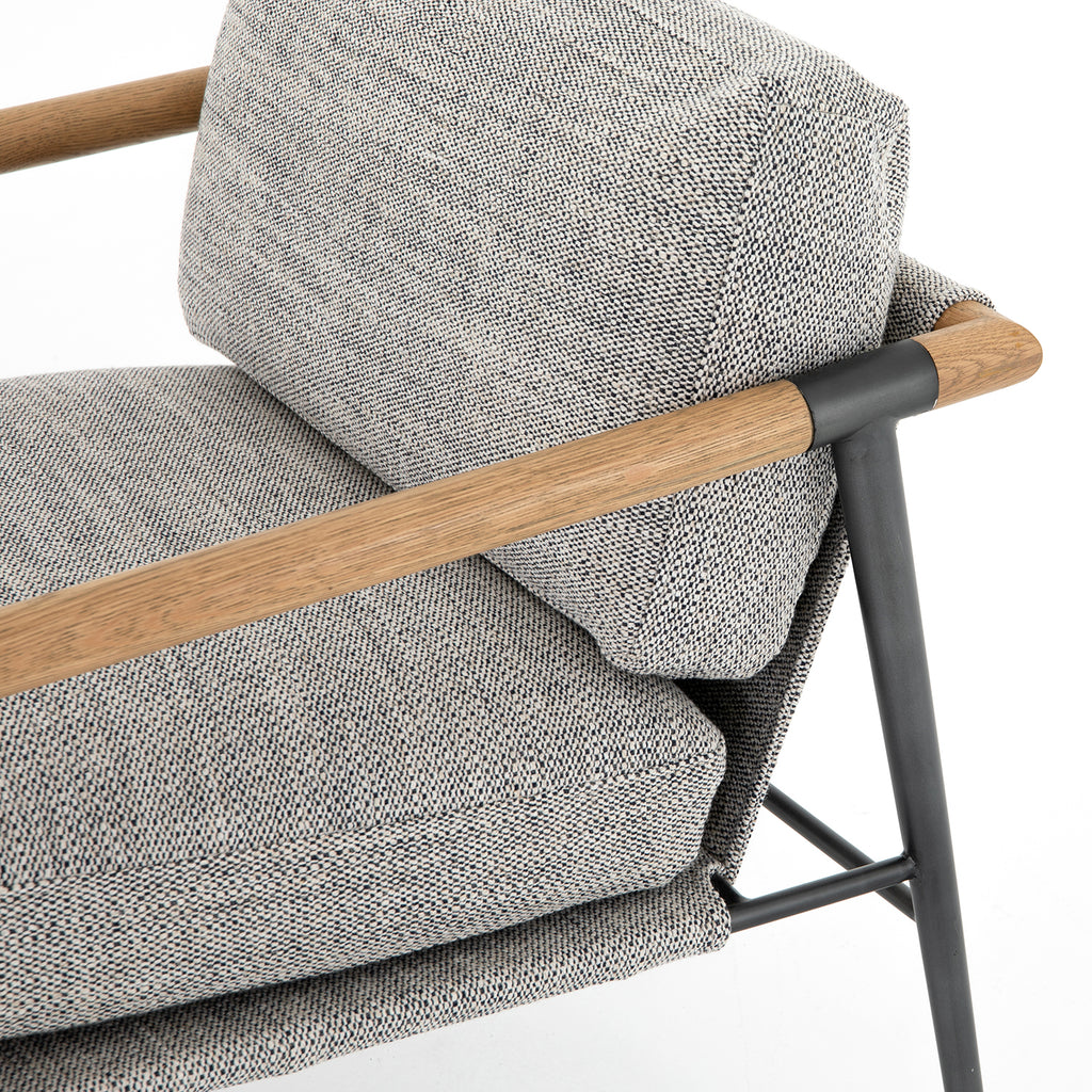 Textural gray or buttery black seating of performance-grade upholstery, with angular arms of exposed oak providing fresh contrast. Slim, carbon-finished steel legs for a dose of modern-industrial edge.