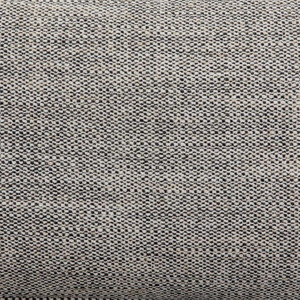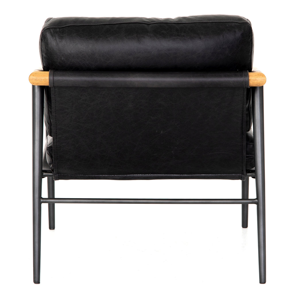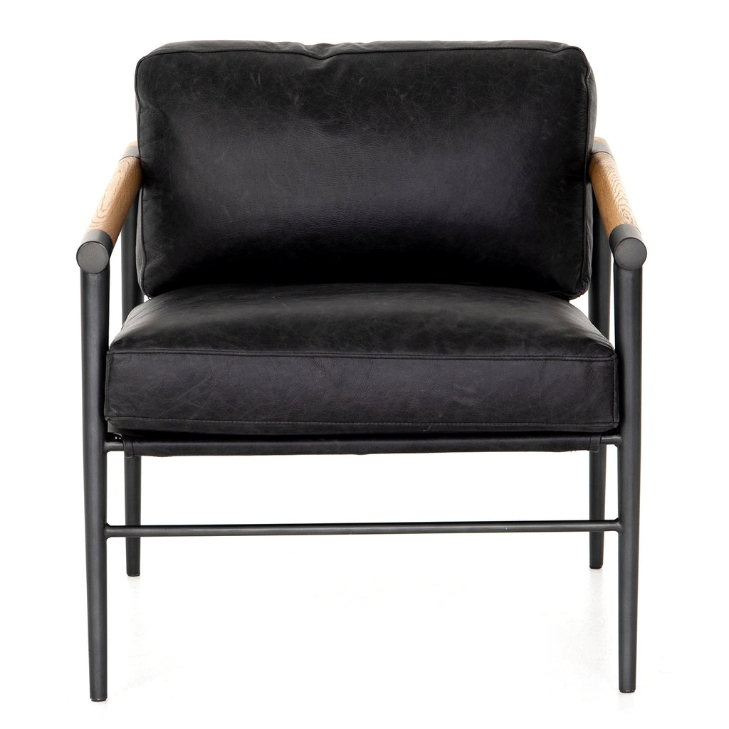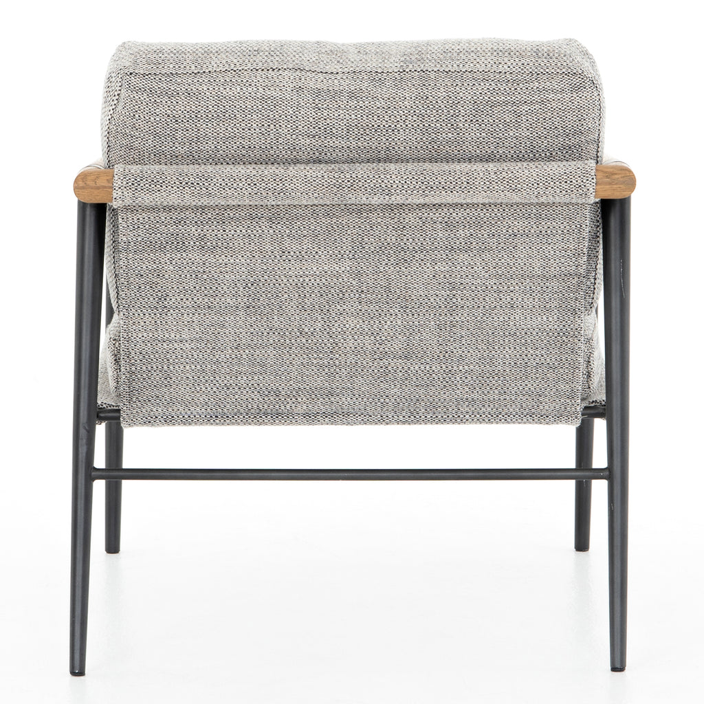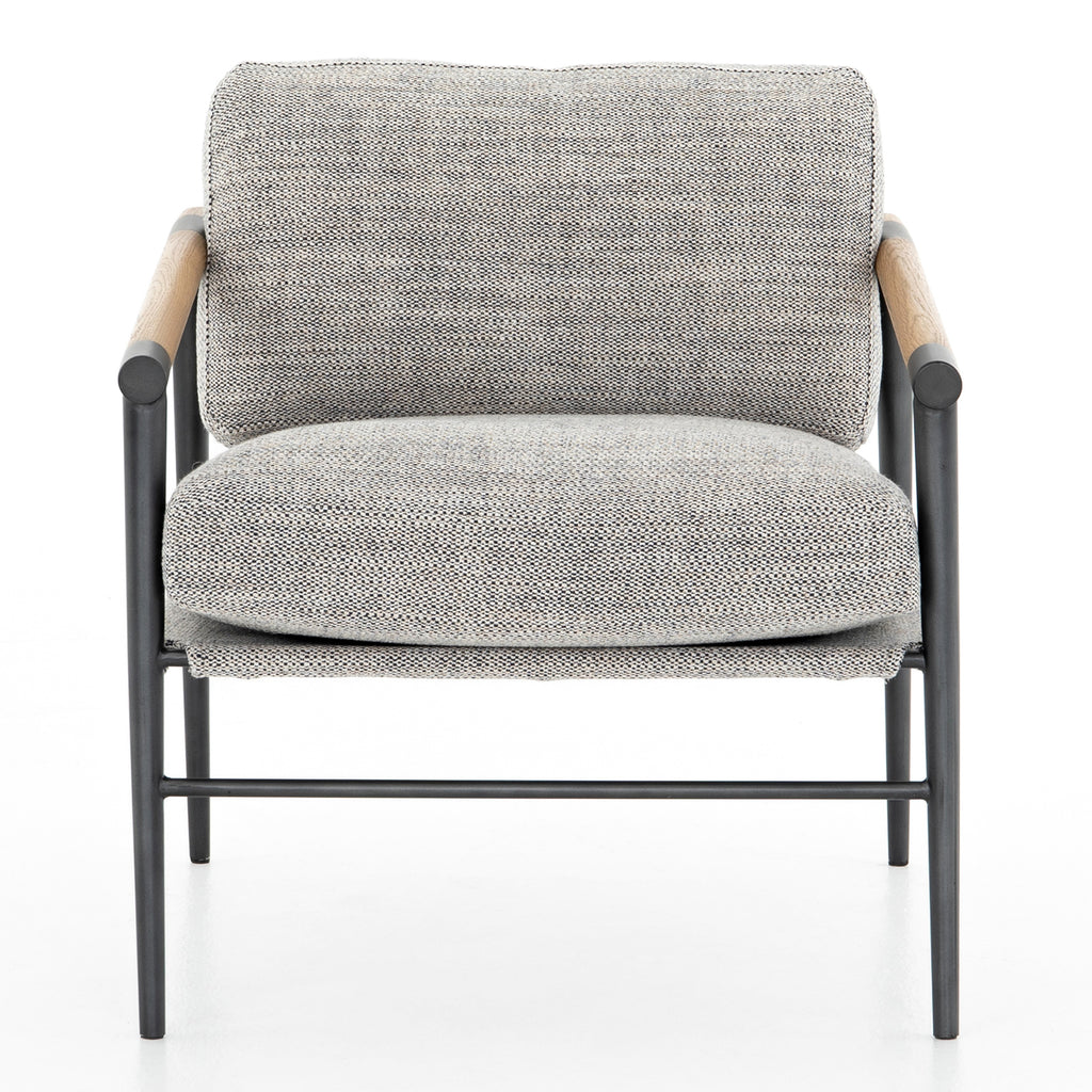 Textural gray or buttery black seating of performance-grade upholstery, with angular arms of exposed oak providing fresh contrast. Slim, carbon-finished steel legs for a dose of modern-industrial edge.
