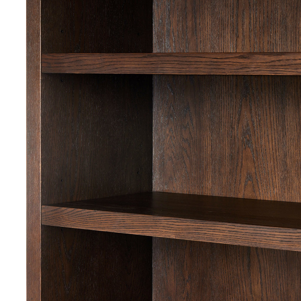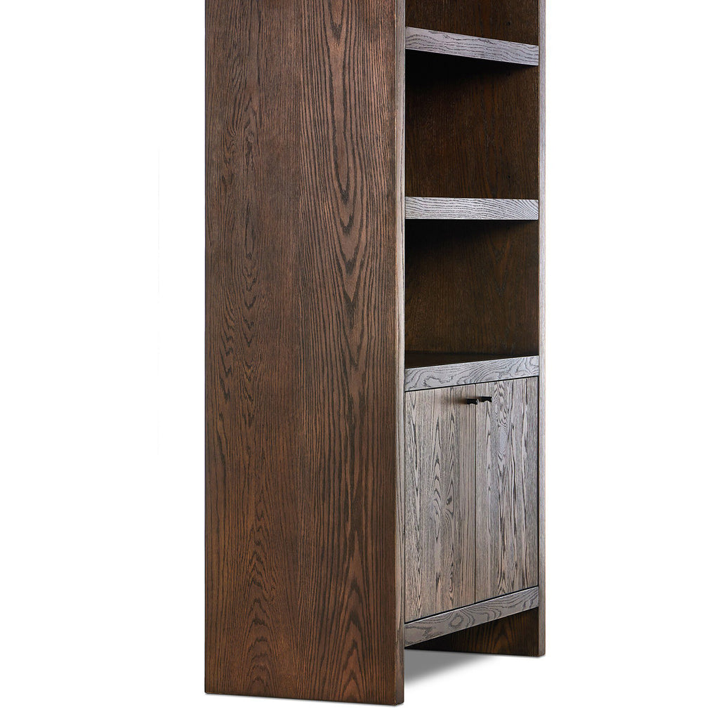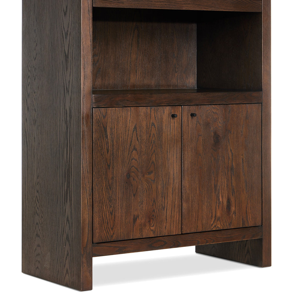 Dark-finished oak shape four clean, spacious shelves, complemented by a two-door cabinet below, bringing bonus storage to your space.