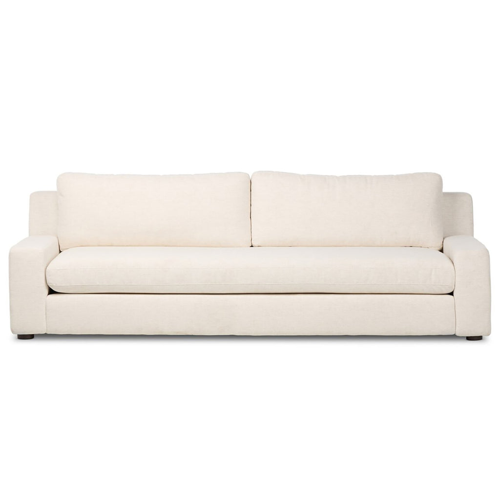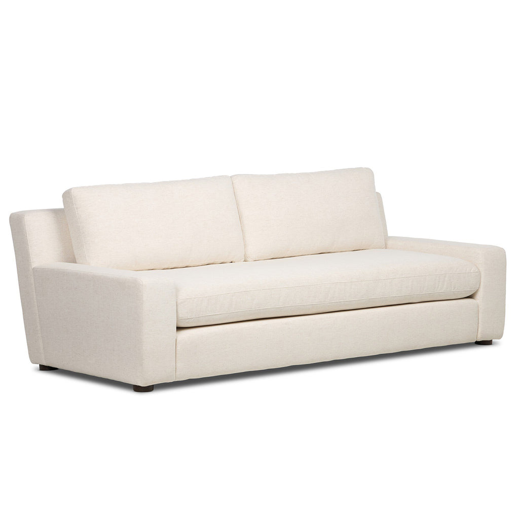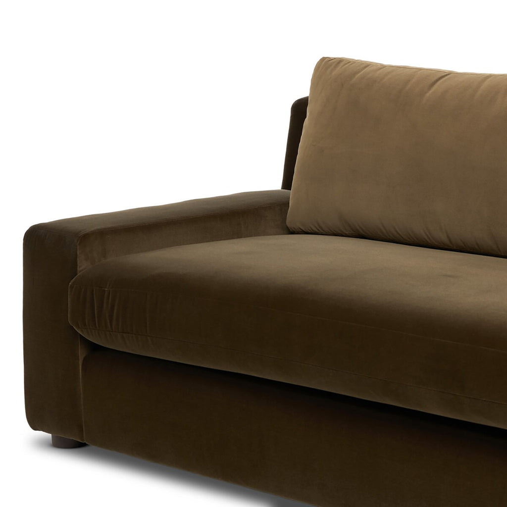 Add a hint of modern to your space with the streamlined silhouette and dramatic side profile of this track arm sofa. Designed with subtle tapering seen from the side and inviting bench-style seating. Crafted with extra plush foam cushions and S-spring suspension. Upholstered in snow-white Crypton® performance fabric or a cotton poly blend velvet olive fabric in a rich hue with subtle movement throughout.
