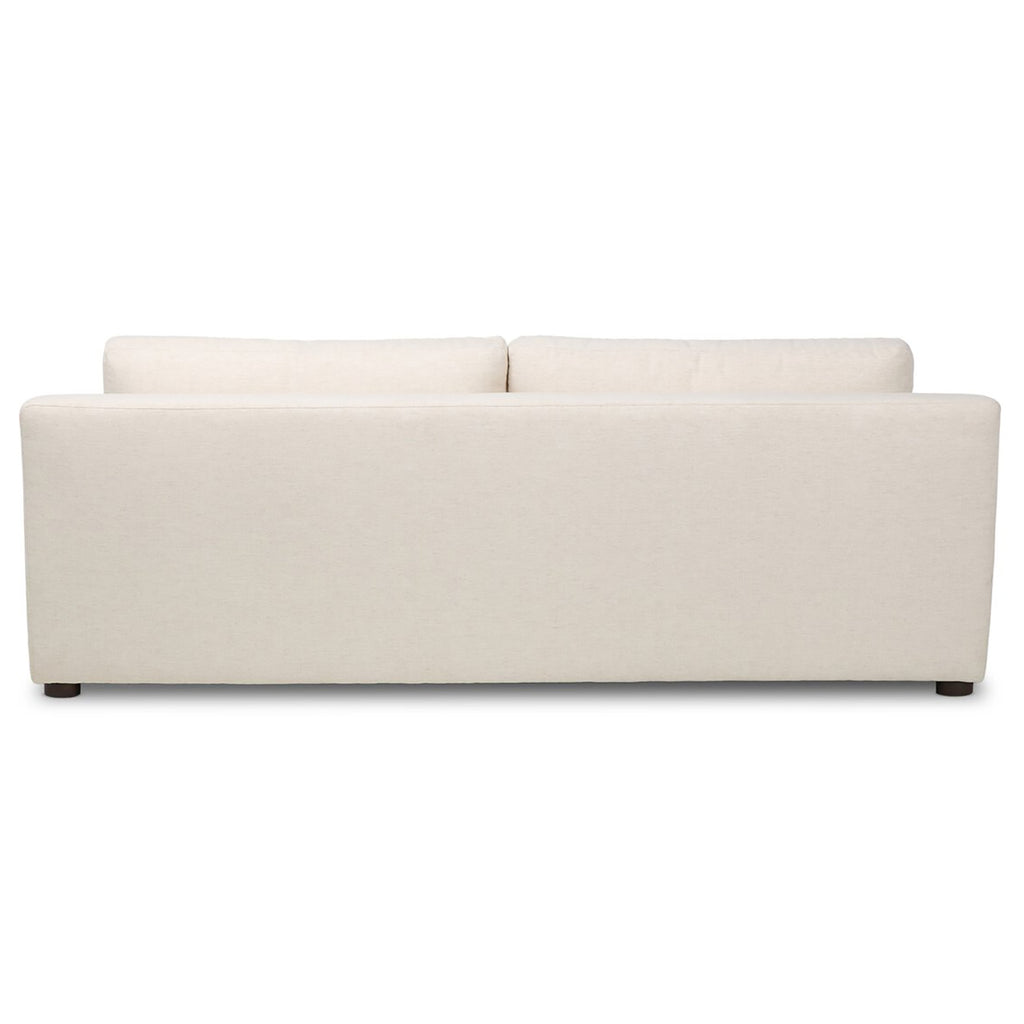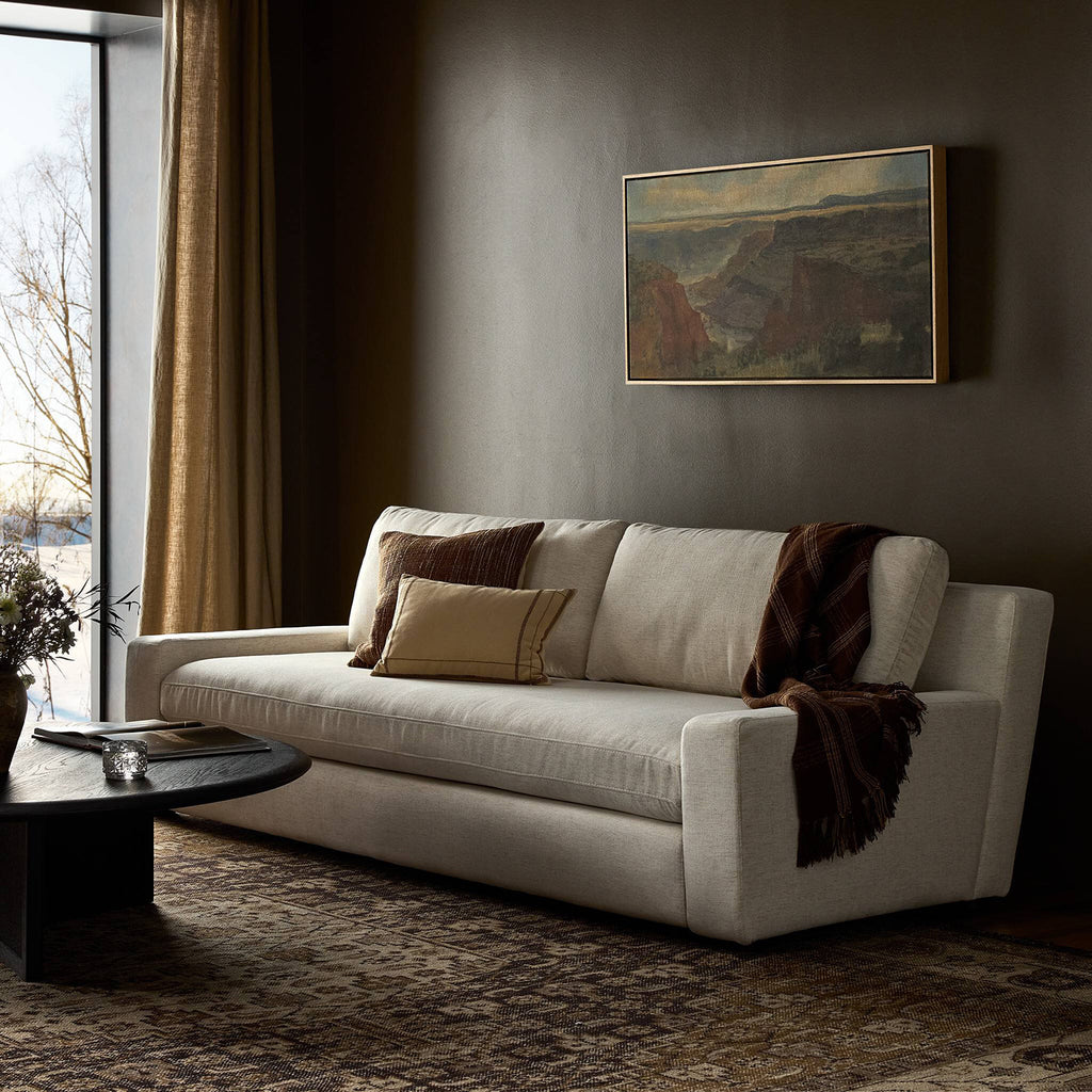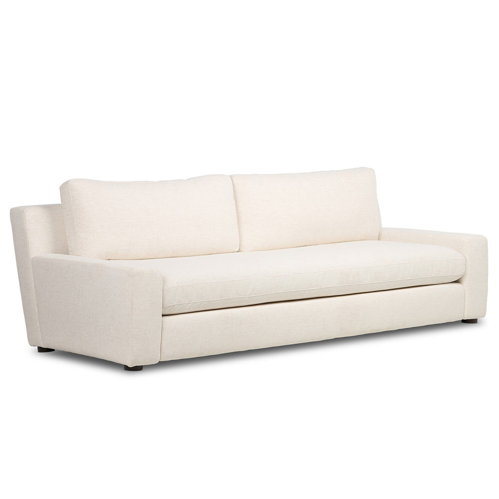 Add a hint of modern to your space with the streamlined silhouette and dramatic side profile of this track arm sofa. Designed with subtle tapering seen from the side and inviting bench-style seating. Crafted with extra plush foam cushions and S-spring suspension. Upholstered in snow-white Crypton® performance fabric or a cotton poly blend velvet olive fabric in a rich hue with subtle movement throughout.