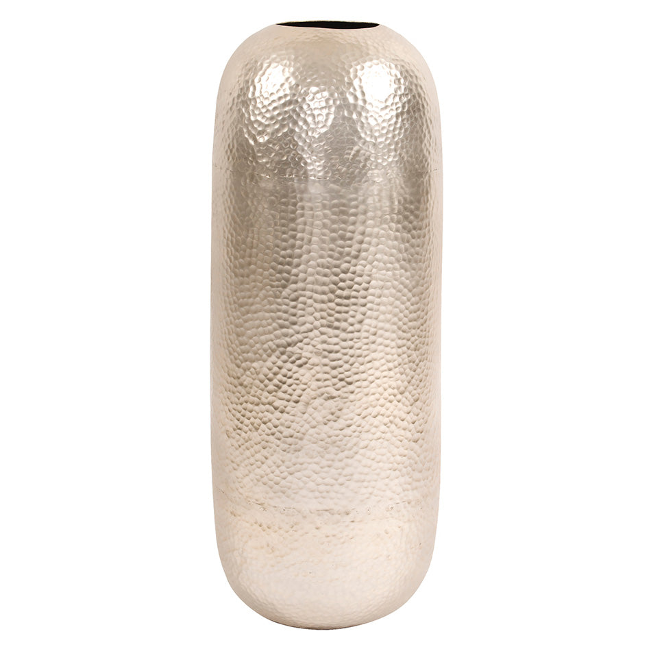The Ganley large silver metal vase is tall and oversized which makes it a perfect cylindrical floor vase. The entire piece is then finished in a champagne silver and characterized by a fine, hammered texture.