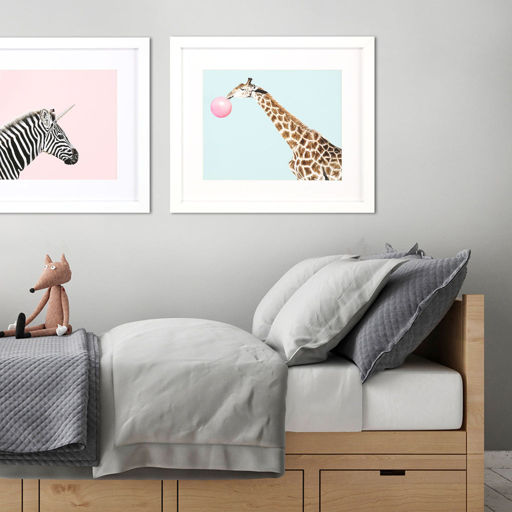 A colorful giraffe youth image that is matted, framed under glass and paired with a matte white frame.