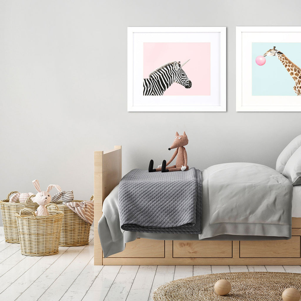 A colorful zebra youth image that is matted, framed under glass and paired with a matte white frame.