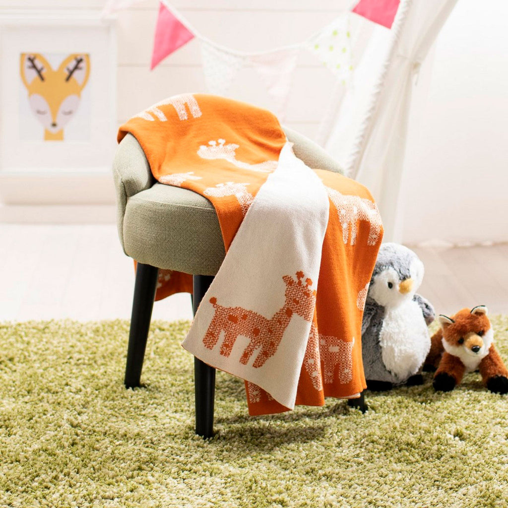Whether snuggled up for the night or out in the stroller with mom and dad, this baby blanket will keep baby warm, comfy and cozy. This playful baby throw blanket is made of pure cotton with a cute giraffe print in soft orange and natural tones. A colorful, gender neutral addition to baby’s nursery.