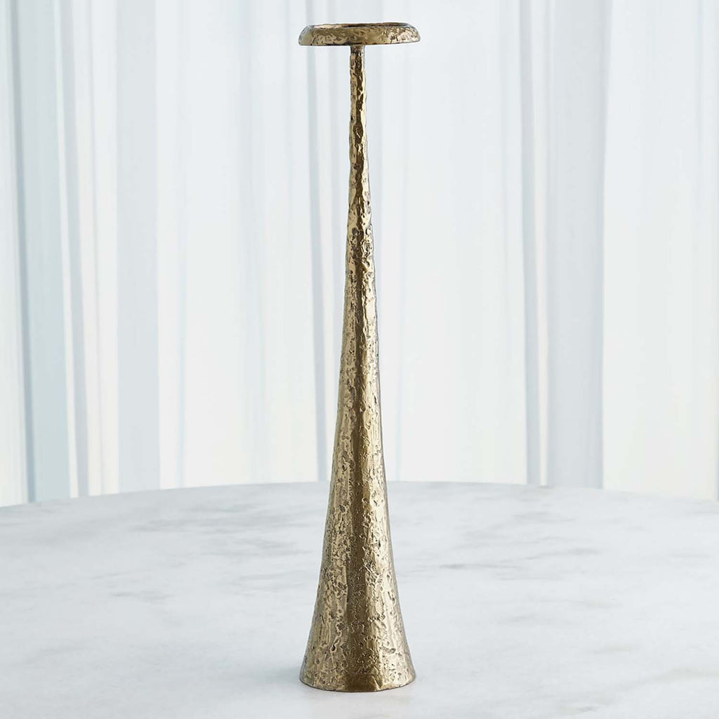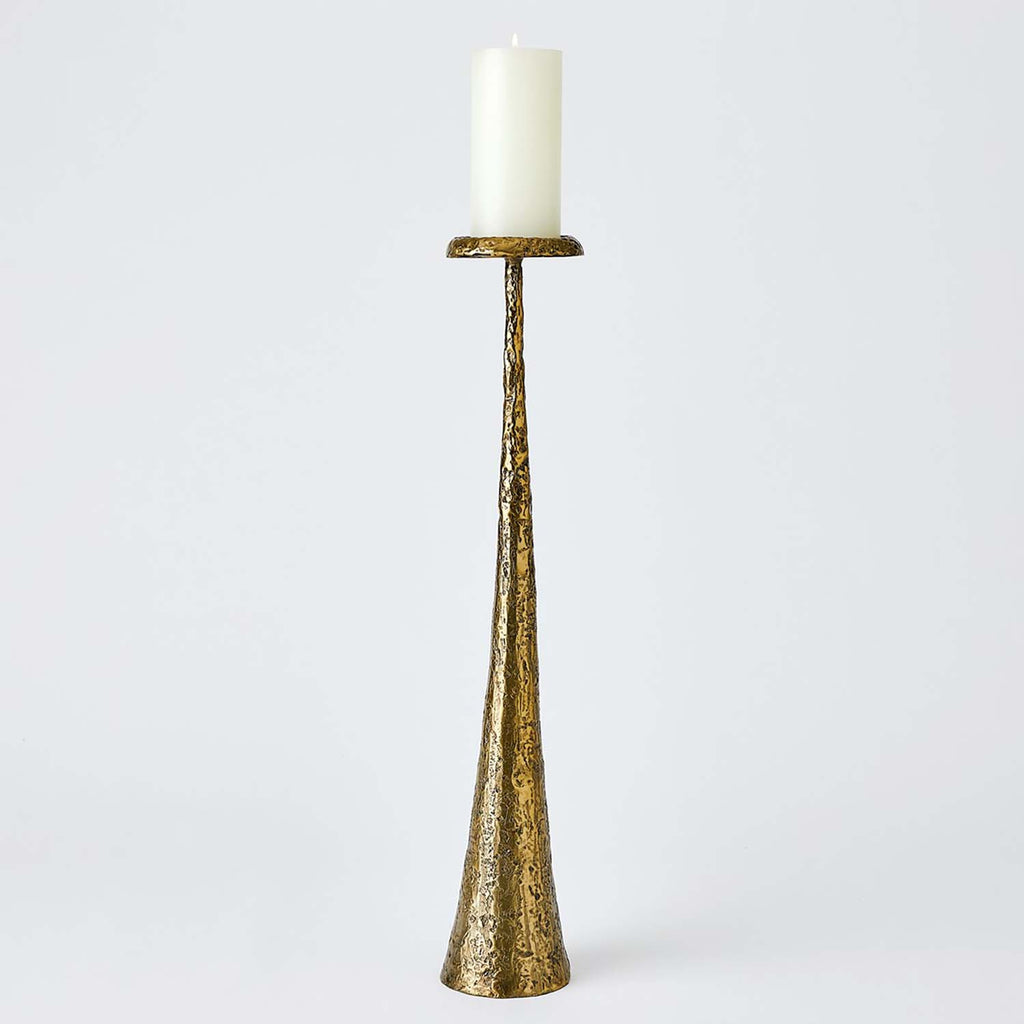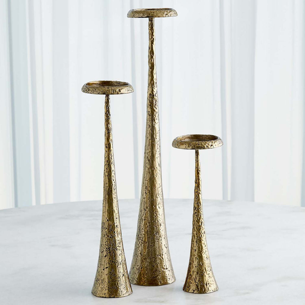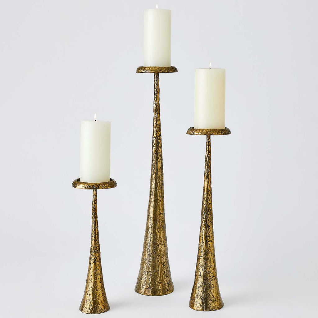 Uniquely tapered and textured finish, our Global Views Beacon Candle Holders are cast from iron and finished in antique brass. Offered in three sizes, each holding a 3' Dia pillar candle.