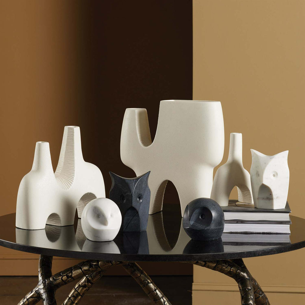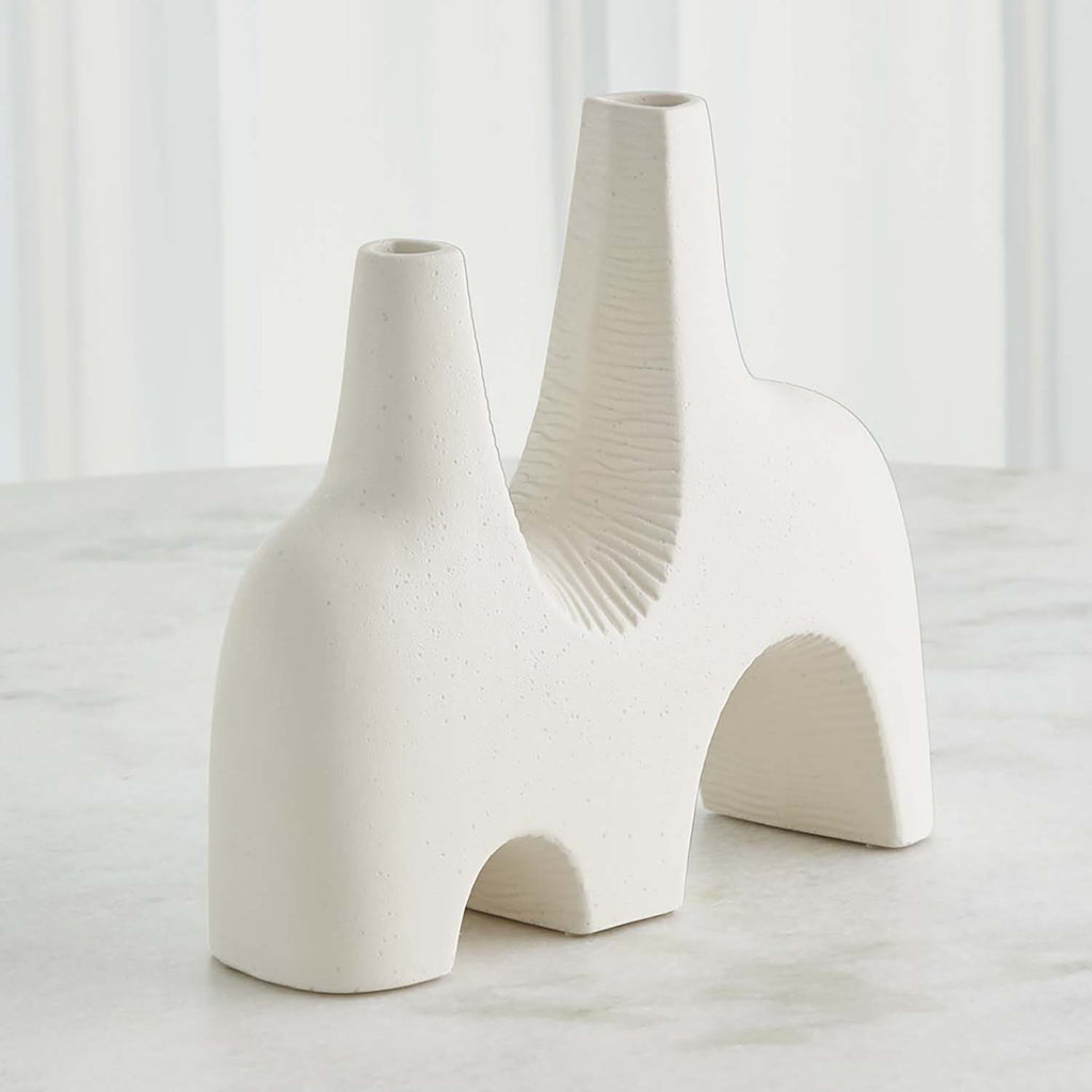 The beautiful organic, abstract shapes of the Global Views Cassel Vases feature a pebbly, rough reactive glaze exterior with striated details in the curves. Slip molded ceramic by Portuguese artisans.