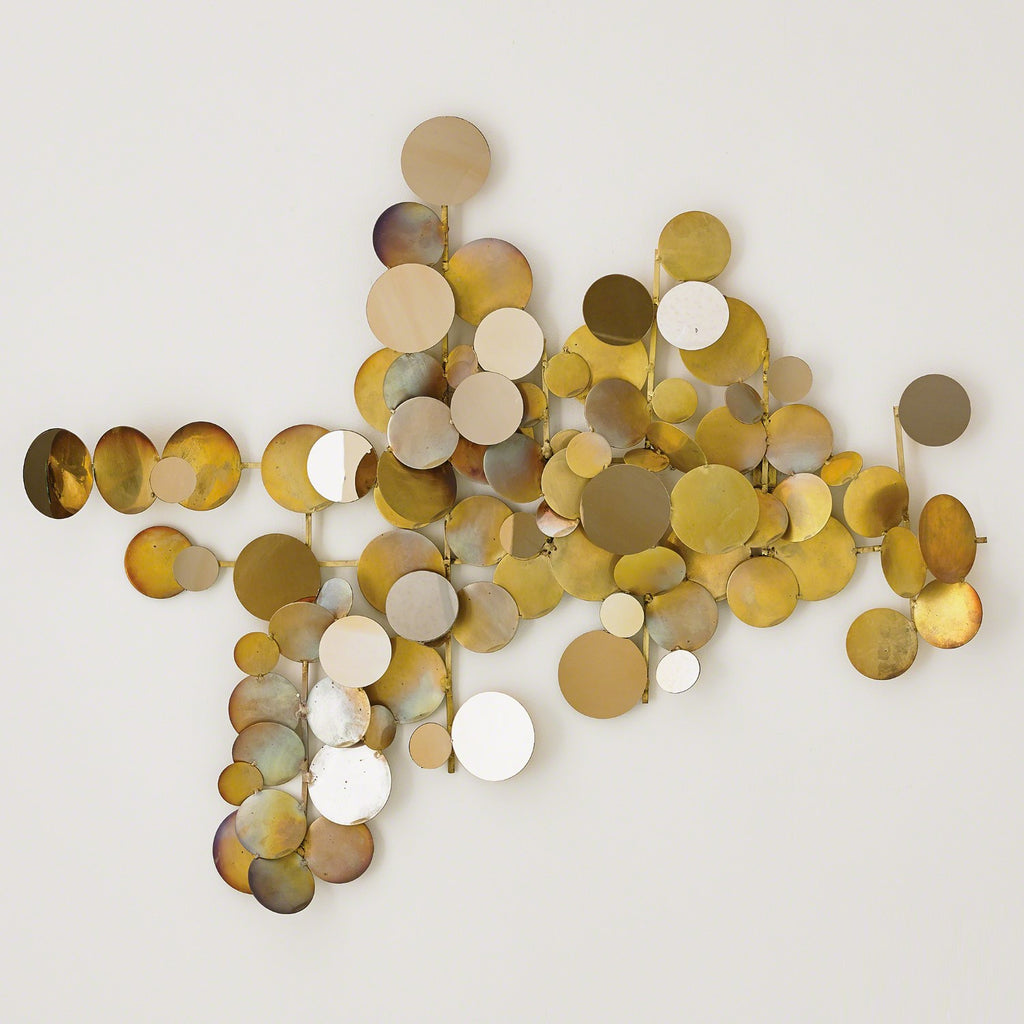 Designed by DwellStudio for Global Views, the Dot Wall Decor is alive with individuality. Urban sheet metal combined with colored glass yields a hip rendition of geometrics inspired by midcentury modern design. It hangs as its own work of art or softens a gallery of rectangular prints for a harmonious display.