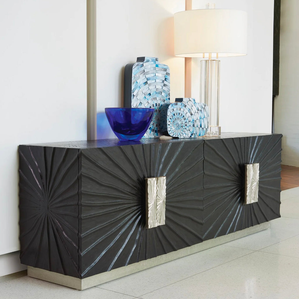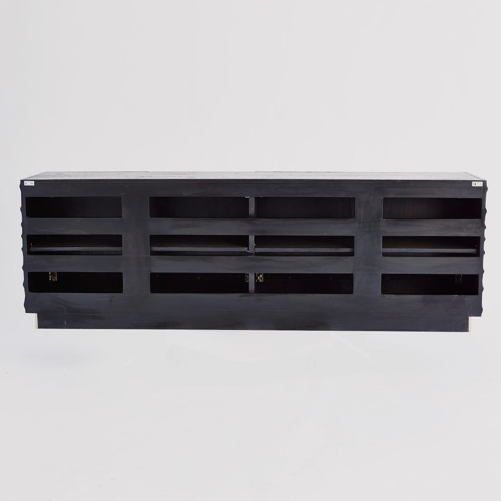Global Views Pleated Media cabinet is vintage inspired. Textured pine wood in a black onyx finish with cast aluminum, door pulls. Equipment cooling slat back and adjustable shelves with a metal clad base.