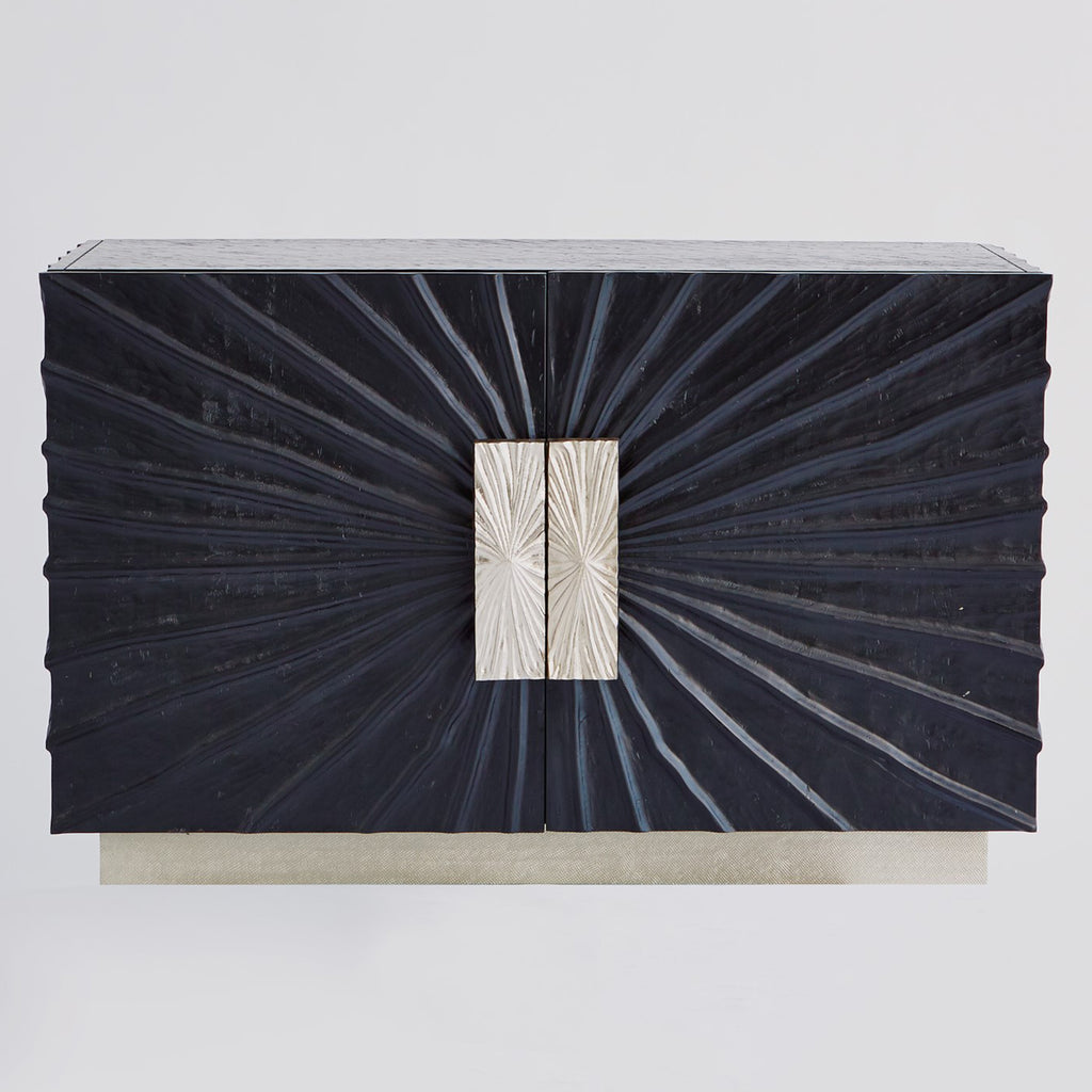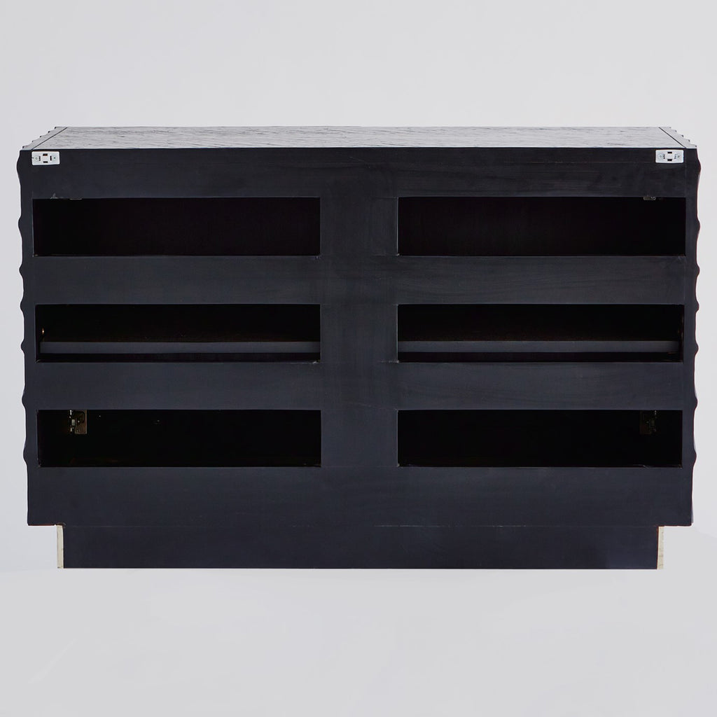 Global Views Pleated Media cabinet is vintage inspired. Textured pine wood in a black onyx finish with cast aluminum, door pulls. Equipment cooling slat back and adjustable shelves with a metal clad base.