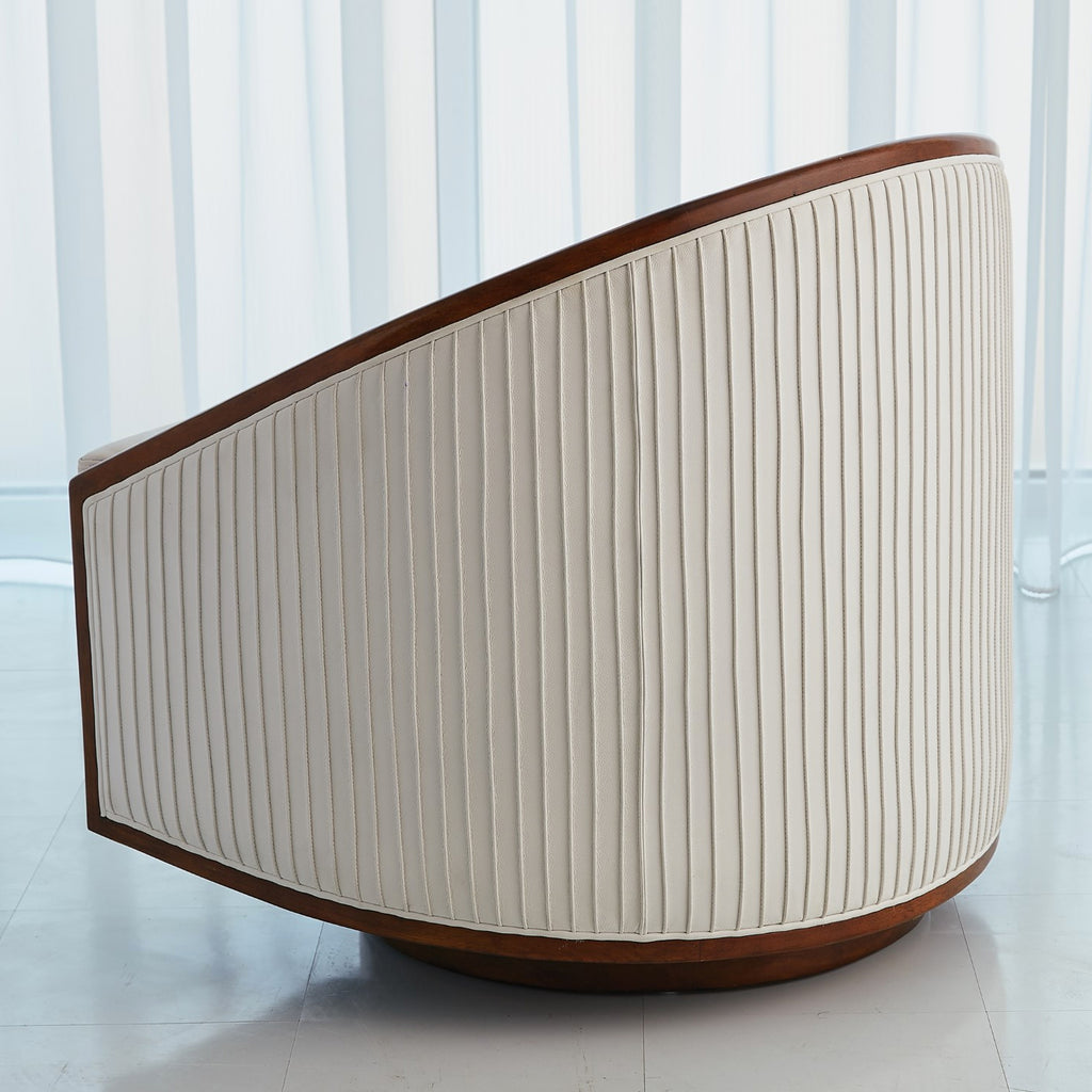 The Global Views Swivel chair is hand upholstered in white leather with a stitched rib back detail. Deep walnut wood finish with a 180 degree swivel and a self-return glide.
