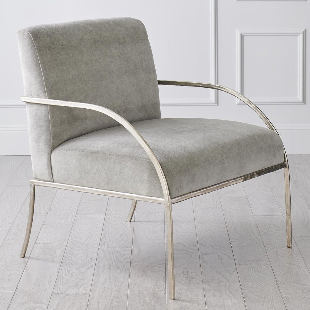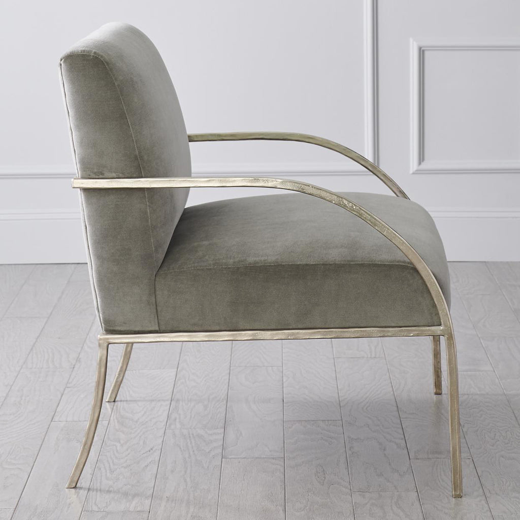 Graceful nickel finished Iron frame is a continues line from leg to, arm to back and back down again. The plush velvet grey cushion is one piece as well.