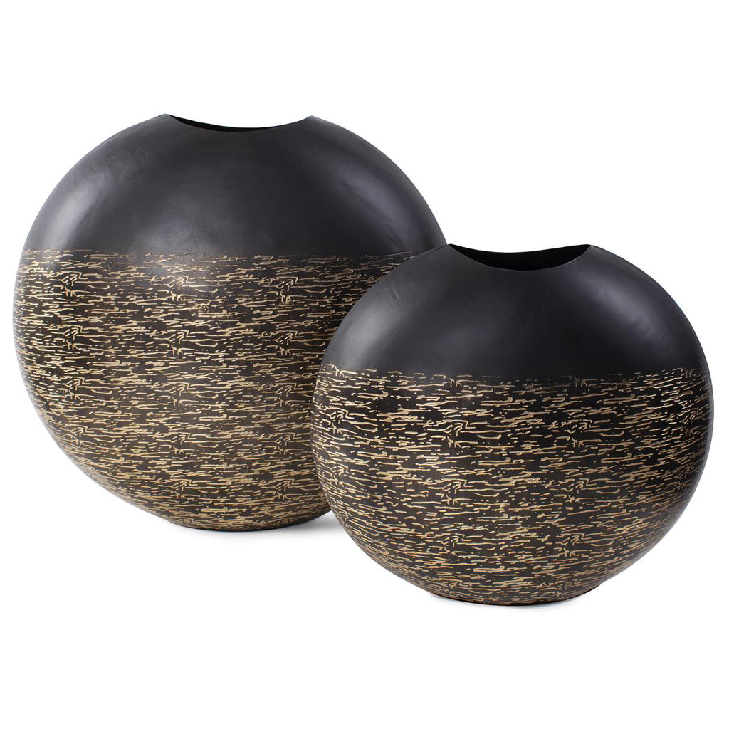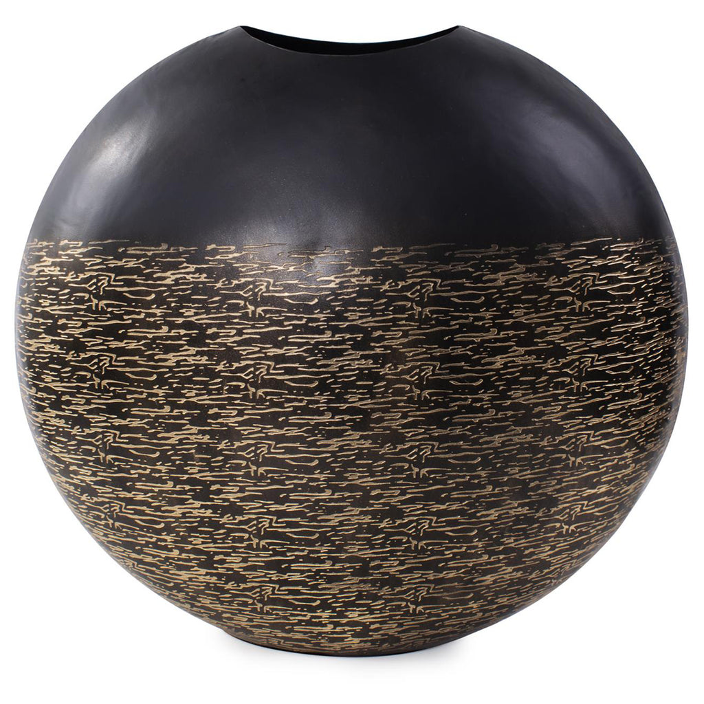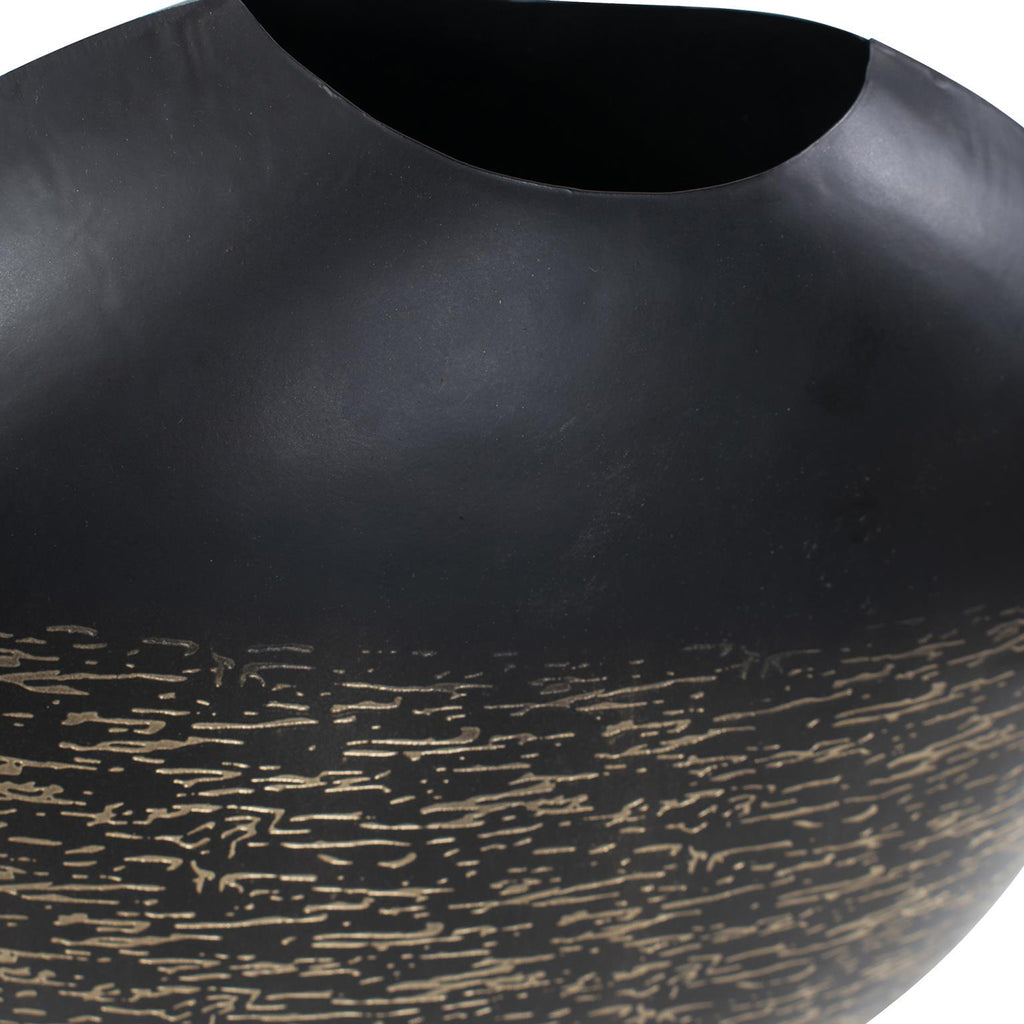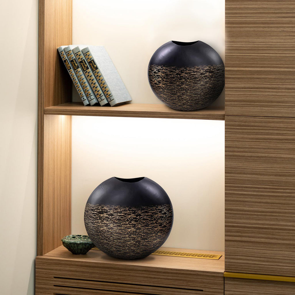 This vase boasts a matte black exterior with delicate light golden etchings adorning its surface, intricately woven like threads, creating a mesmerizing visual effect. These golden threads not only add depth and texture but also a touch of opulence to the vase's minimalist form. Whether displayed as a solo statement piece or paired with others in the collection to create a harmonious ensemble, this vase invites you to explore the play of light and shadow.