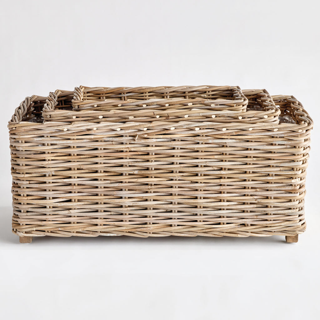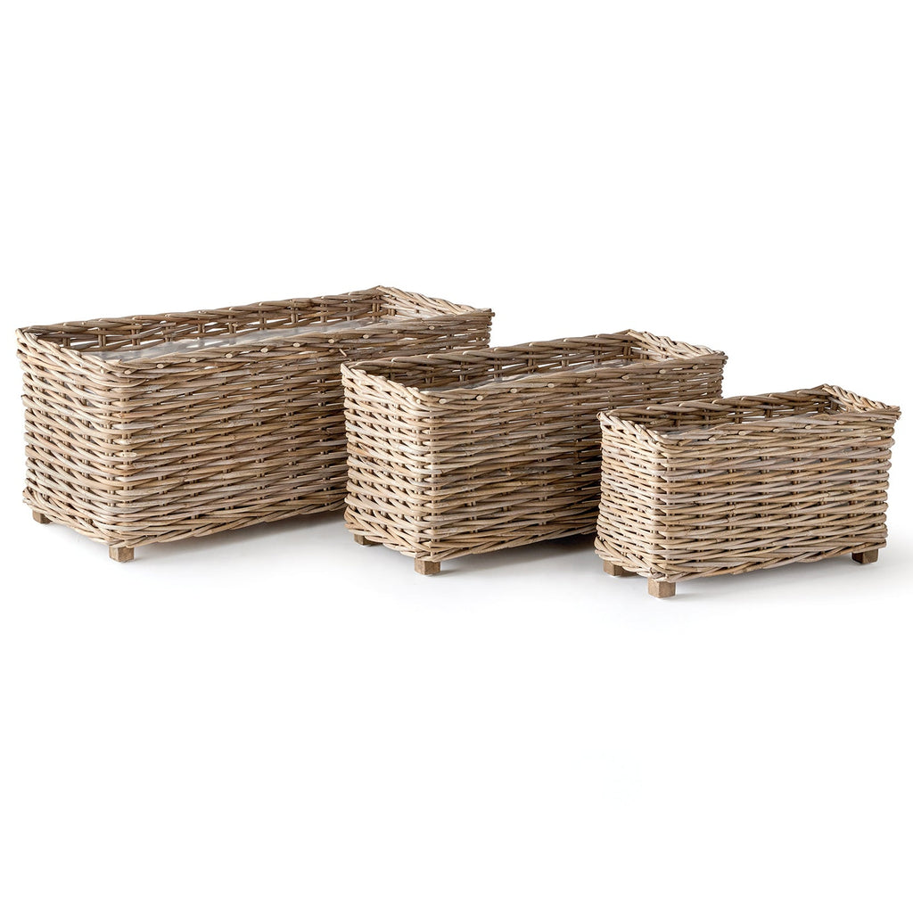 These overscale rectangular planters will steal the show! Designed with a solid wood frame for stability, and elevation, and fitted with plastic liners to keep them clean and dry. This set of three make a stunning coordinating set for your creative planting.