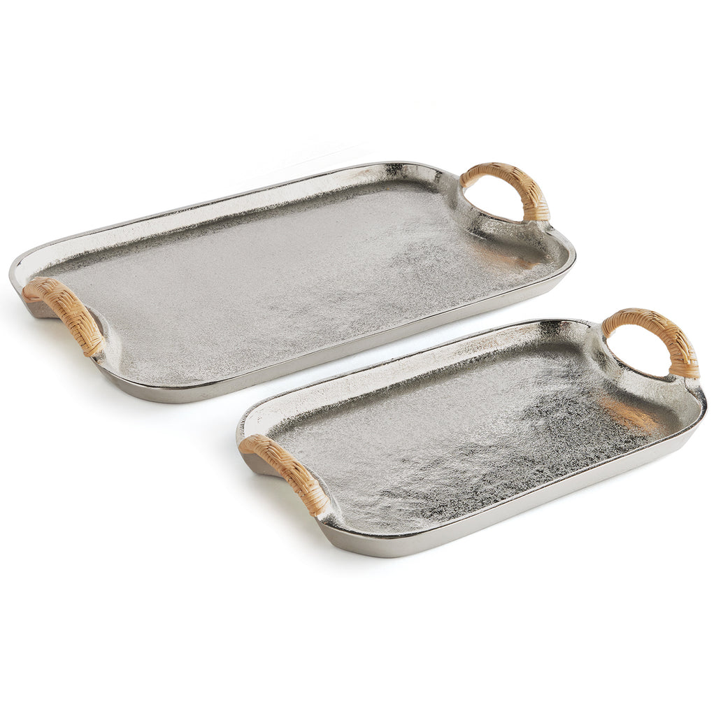 Made of cast aluminum in a warm silver finish, these modern trays have natural rattan-wrapped handles. Sit atop a kitchen island, dining table or mantle for a designer look.