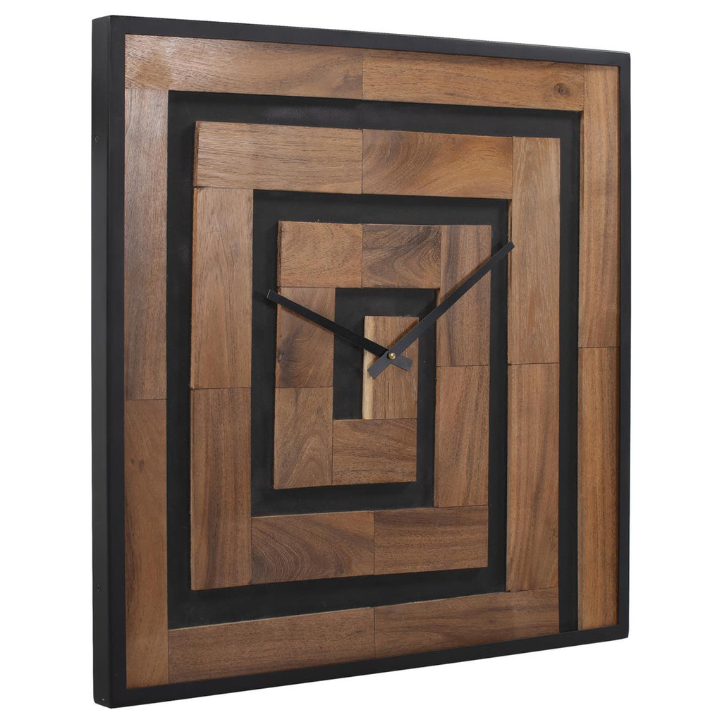 Elevate your wall decor with a stunning timepiece that combines the elegance of wood with modern design sensibilities. The clock features a square wooden face in a rich, deep color, providing a warm and inviting focal point. Adding a touch of contemporary flair, a thin black frame encircles the face, enhancing its presence and defining its edges. What sets this clock apart is the square swirl that flows through the wooden surface, adding depth and visual intrigue to the design. With matte black accents that include sleek hands and hour markers, this clock combines functionality with artistic beauty.