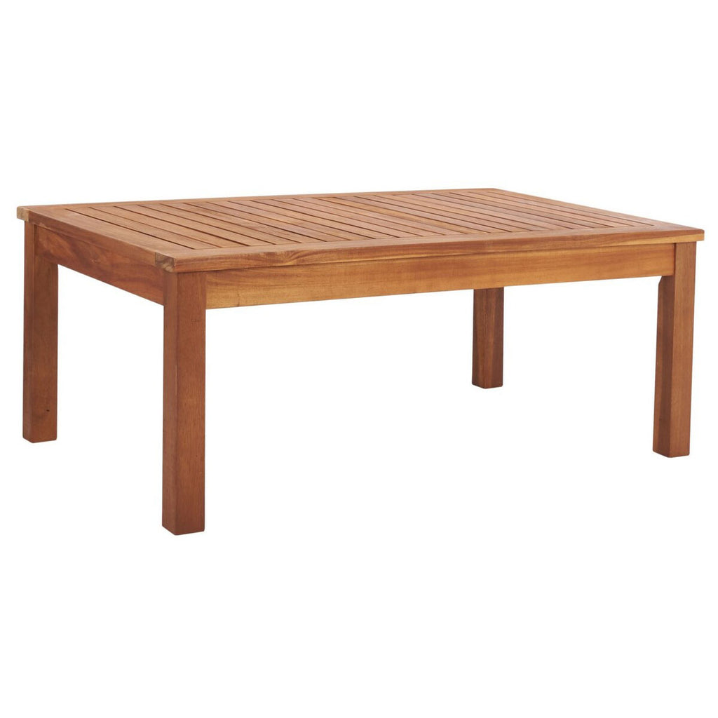 Traditional garden party furniture is given a contemporary-chic upgrade in this 6-piece outdoor living set. This patio set includes two armchairs, one loveseat, and one ottoman topped in plush beige upholstery as well as one accent table and one coffee table, designers are obsessed with the crossed X accents on the natural-finished wood frames.