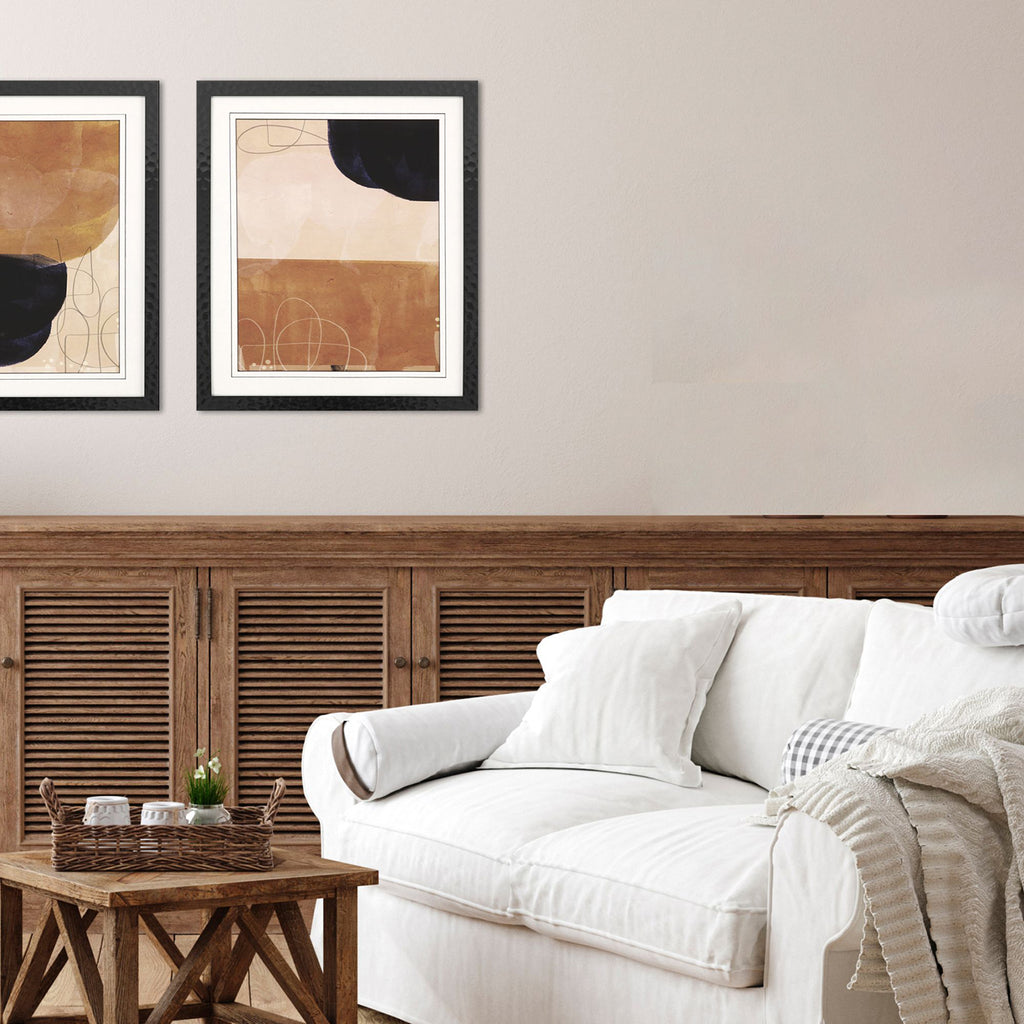 This single neutral contemporary print is single matted with a premium mat and framed under glass with a complimenting dimensional sleek black frame.
