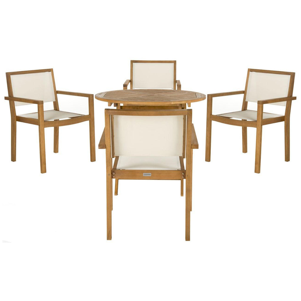 For endless fun in the sun look no further than this classic 5-piece dining set. A modern investment, its 34.5 round dining table and four ample chairs are crafted in a natural hue and feature timeless white upholstery. Designers love its versatility and value. Sold as set of 5.