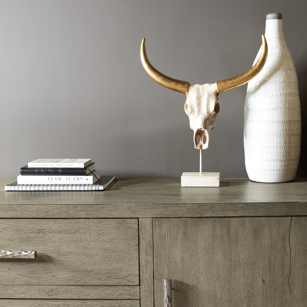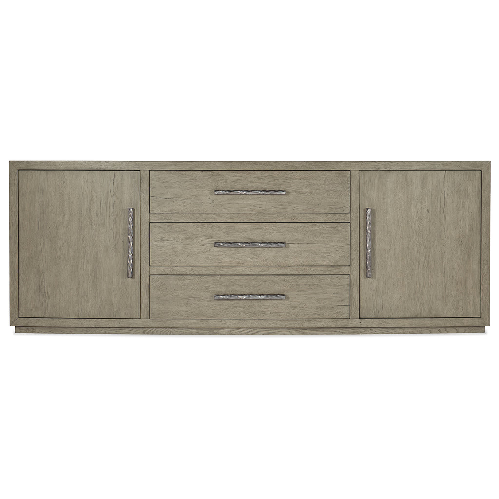 Capturing the essence of nature’s organic color palette on a clean-lined, simple silhouette, the Linville Falls Entertainment Console is crafted of Oak Veneers with a soft smoked gray Mink finish and textured metal bar pulls in an antique pewter color. Accommodating up to an 80-inch TV, the console has two doors with soft-close hinges and one adjustable wood shelf each door, along with 3 self-closing drawers. Functional features include a ventilated back panel with wire management and an 5C705 3-plug outlet.