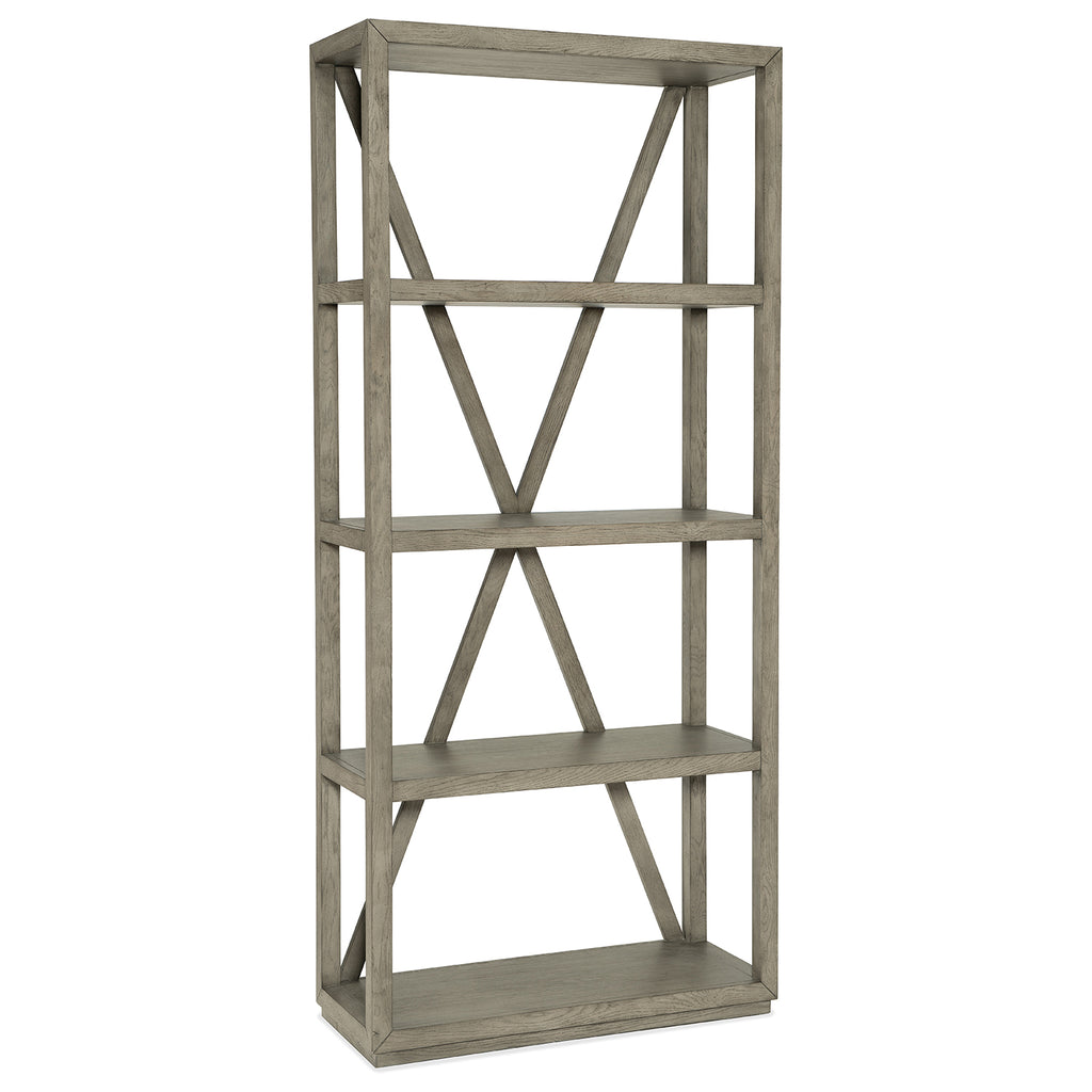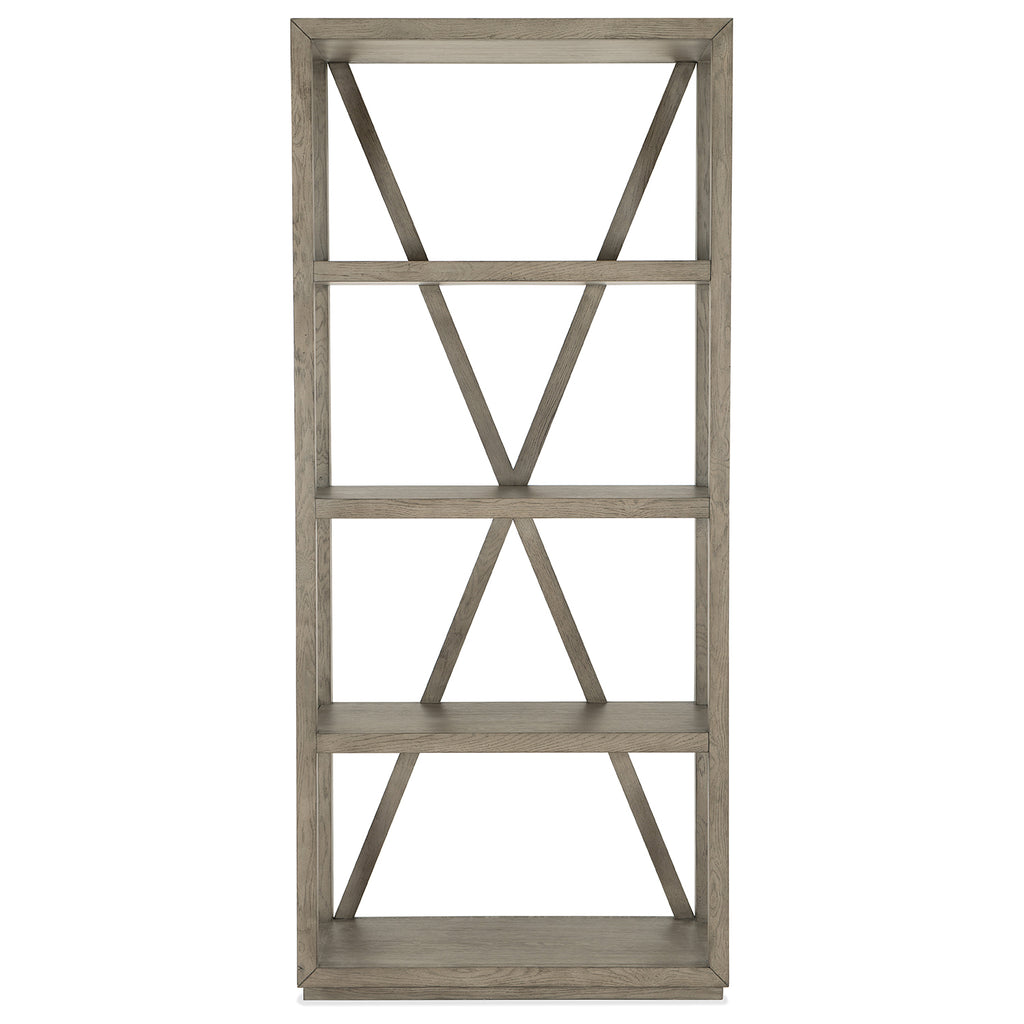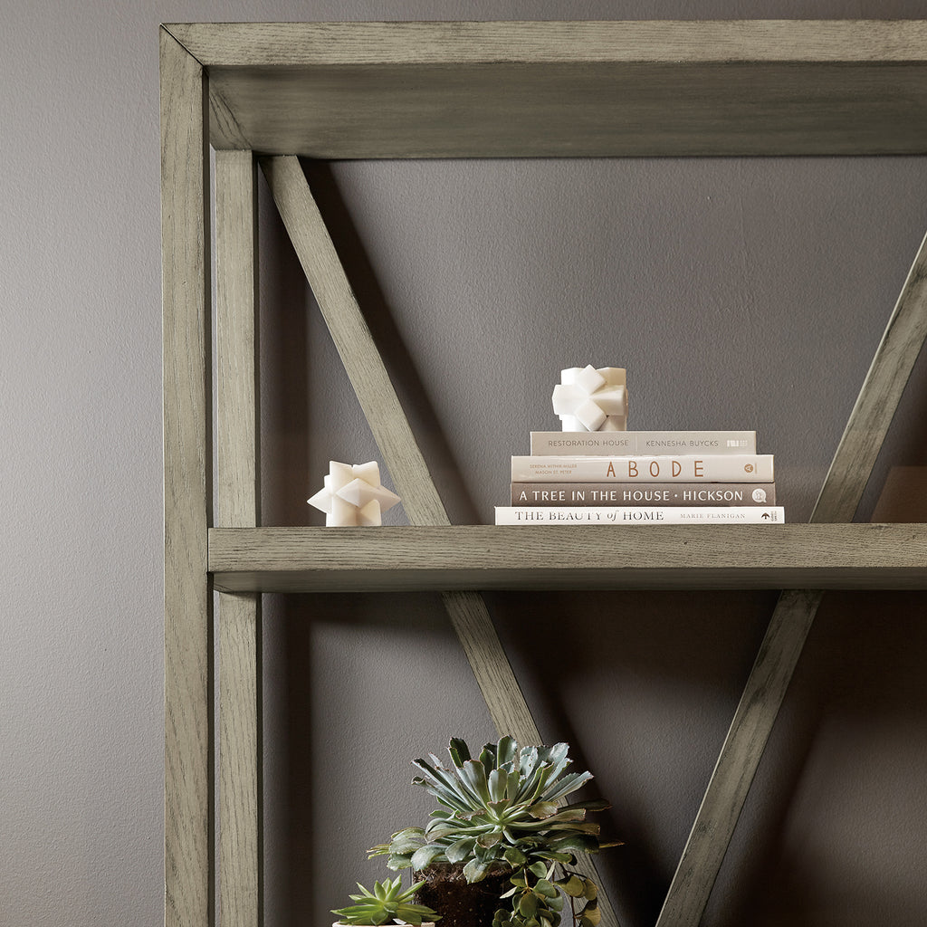 With a rustic, weathered finish, crisp lines and an organic grain pattern, the Wisemans Etagere has a classic X-back and chic silhouette with four fixed shelves. Crafted of Oak Veneers, the etagere is finished in the soft smoked gray Mink. Anti-tip hardware is included.