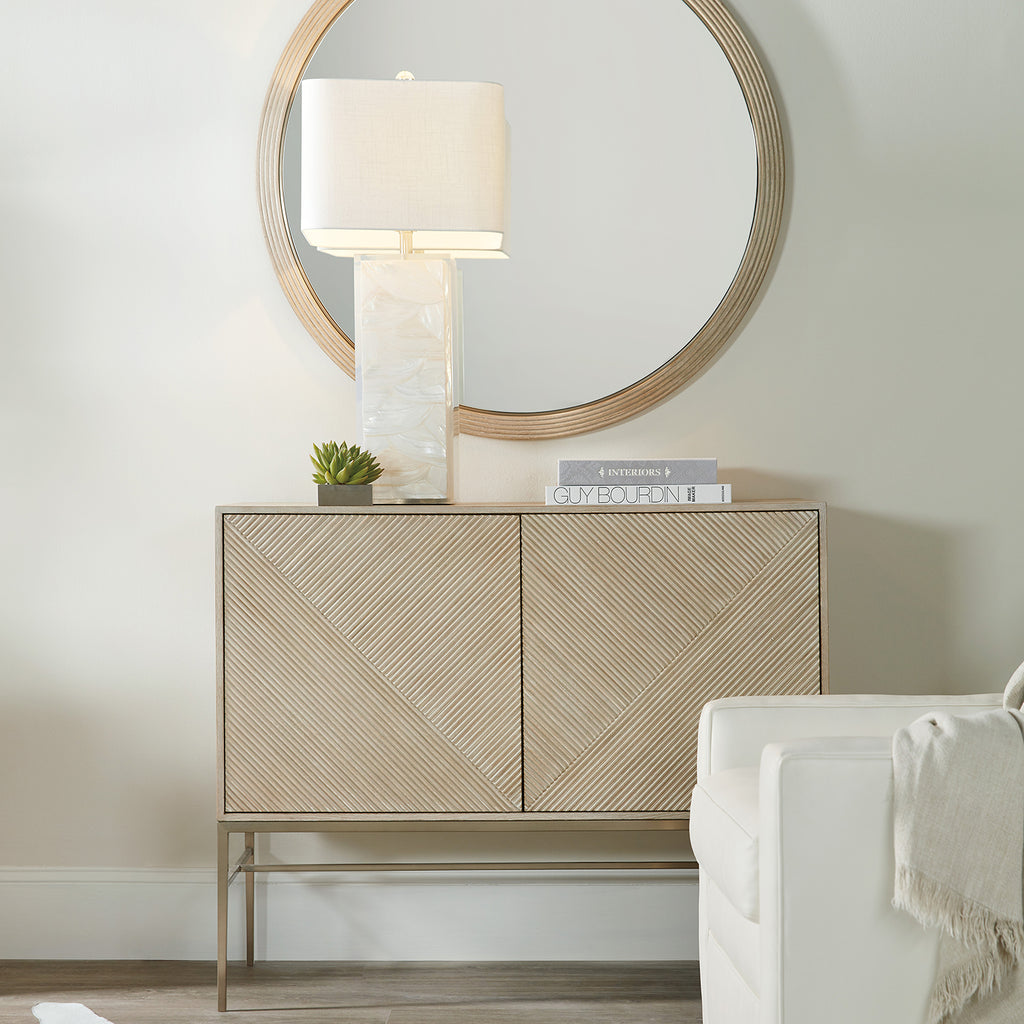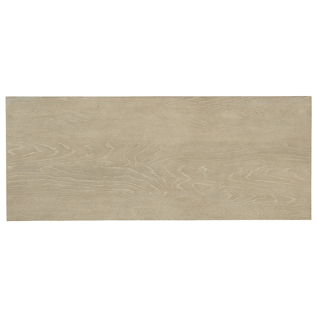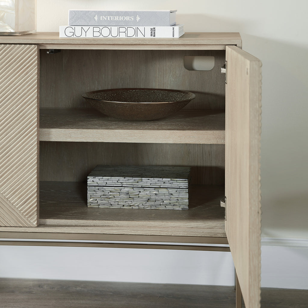 With a tranquil Zen vibe, the versatile Cascade Credenza is crafted of Oak Veneers in a soft taupe finish with slender metal legs. The Terrain finish is dry-brushed for a casual and tactile feel with reeded fronts on the two doors. The pair of doors has soft-close hinges and touch latches and one adjustable shelf .