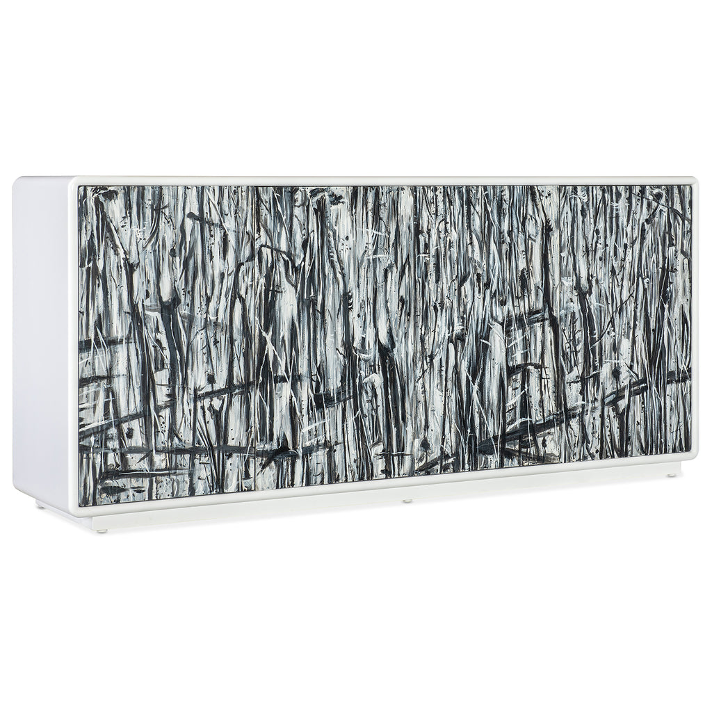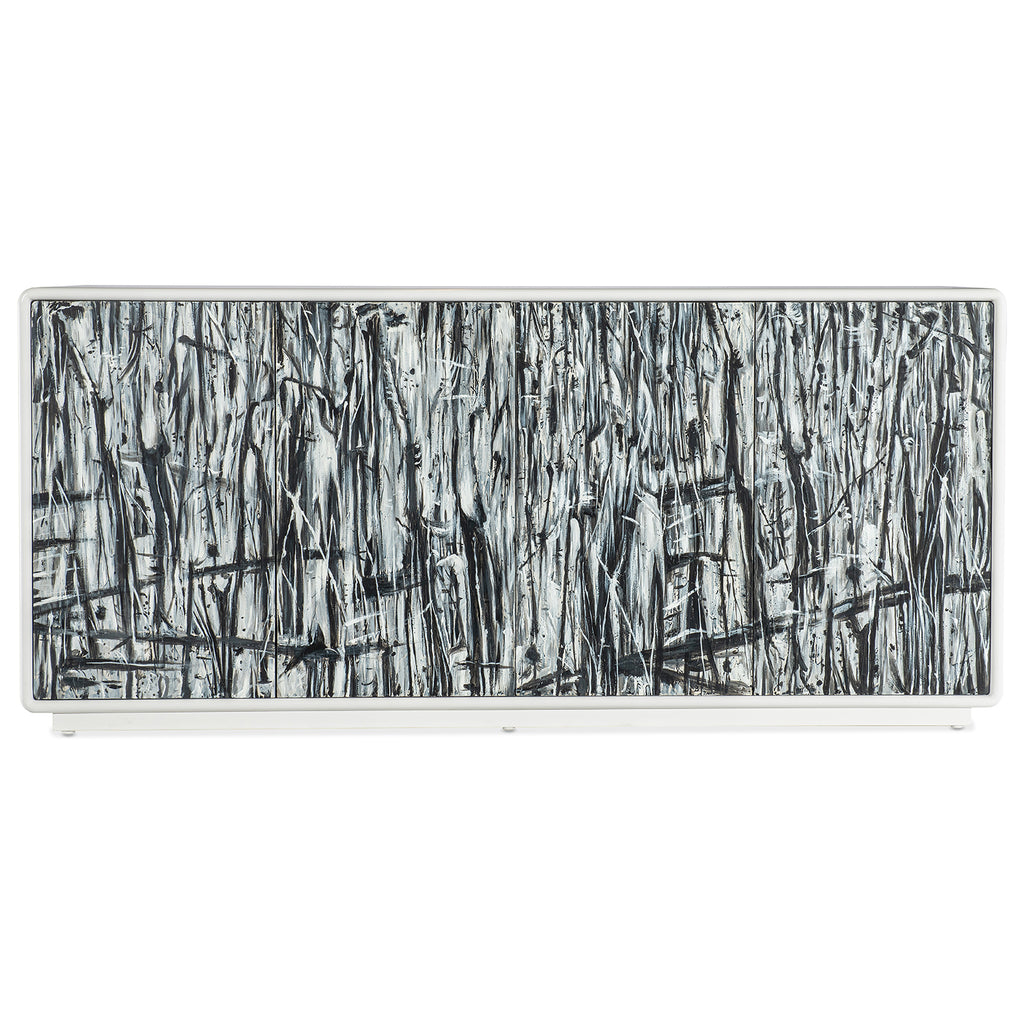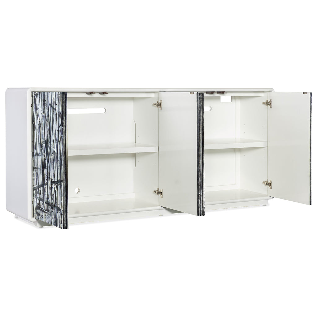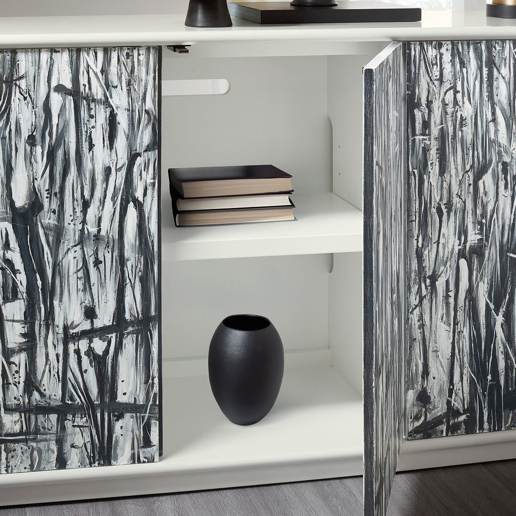Abstract and elemental yet elegant, the Graffitio Credenza is an intriguing and artsy piece with bonus function. The door fronts in a white, gray and black hand-painted design open to reveal two adjustable shelves behind each pair of doors and wire management holes. Crafted of Maple Veneers, the credenza has a plinth base, and the doors open effortlessly with touch latches.