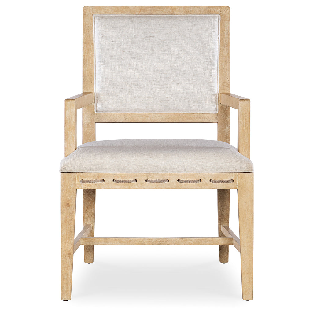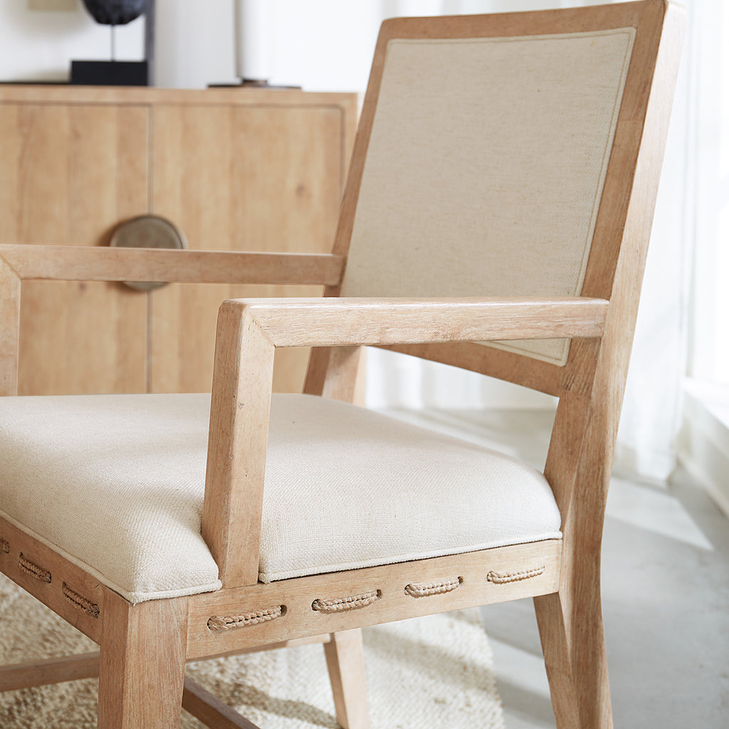 Island Oasis meets Organic Modern in the Retreat Raffia-Back Arm Chair. In a mixture of natural materials including wood, raffia cane, rope and fabric, the armchair is comfy and chic. The seat and back of the chair is upholstered in the Wiley Snow neutral performance fabric, and the seat apron features rope trim. The back of the chair is covered in raffia cane, and the chair frame, stretcher and legs are finished in the sand-colored Dune, transparent by design to reveal the unique grain patterns of the veneer.