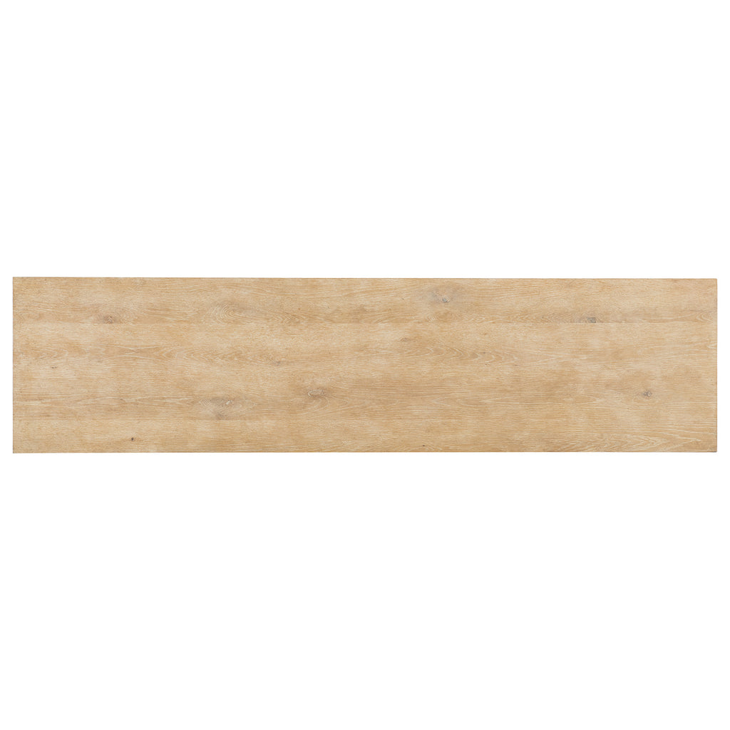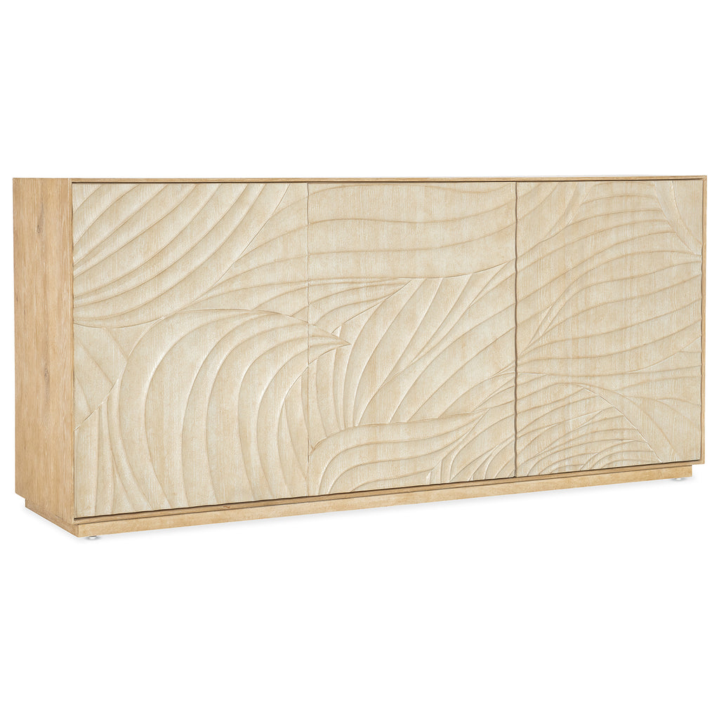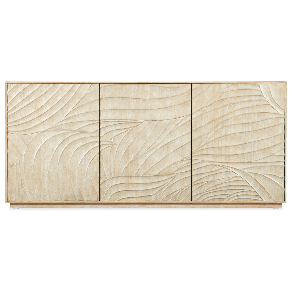 Tranquil and modern with a tropical retreat-inspired vibe, the Retreat Entertainment Center has a striking carved wave motif on the door fronts. Crafted of Oak Veneers and Resin, the case is finished in the sand-colored Dune finish, while the door fronts have a lighter contrasting finish. The entertainment center features three doors with soft-close hinges and touch-latches, two adjustable shelves behind the left door, two adjustable shelves behind the pair of right-side doors, a ventilated back panel and a three-plug electrical outlet located behind the pair of right doors.