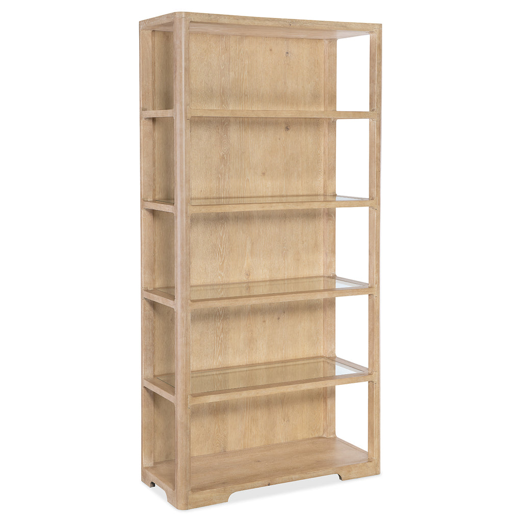 Inspired by tranquil, tropical resort destinations, the Retreat Etagere will help you create a peaceful setting in your home. Featuring four fixed wood-framed tempered glass shelves, the etagere is crafted of Oak Veneers finished in the sand-colored Dune finish, transparent by design to showcase the unique patterns of the wood veneer.