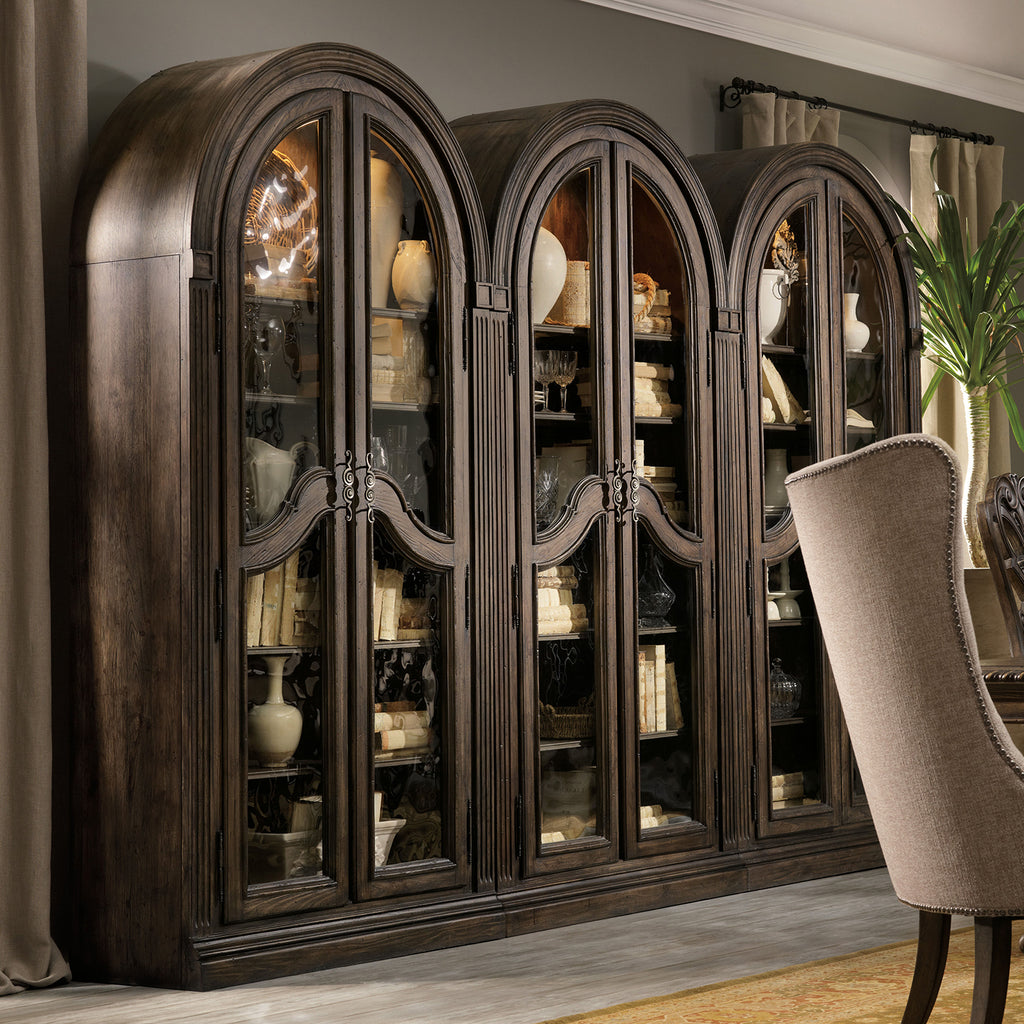 In storybook style, the romantic, softly-shaped Rhapsody Curio exudes casual opulence and classic European design pedigree. The laid-back luxury of the walnut-colored finish inspired by rustic reclaimed wood in beautiful patinas updates the curio for today's casual lifestyles. Behind two seeded glass doors are two top adjustable and wood-framed glass shelves with plate grooves. The center shelf is fixed, and the bottom two shelves are adjustable. Use this lovely curio alone, or bunched in twos or threes.