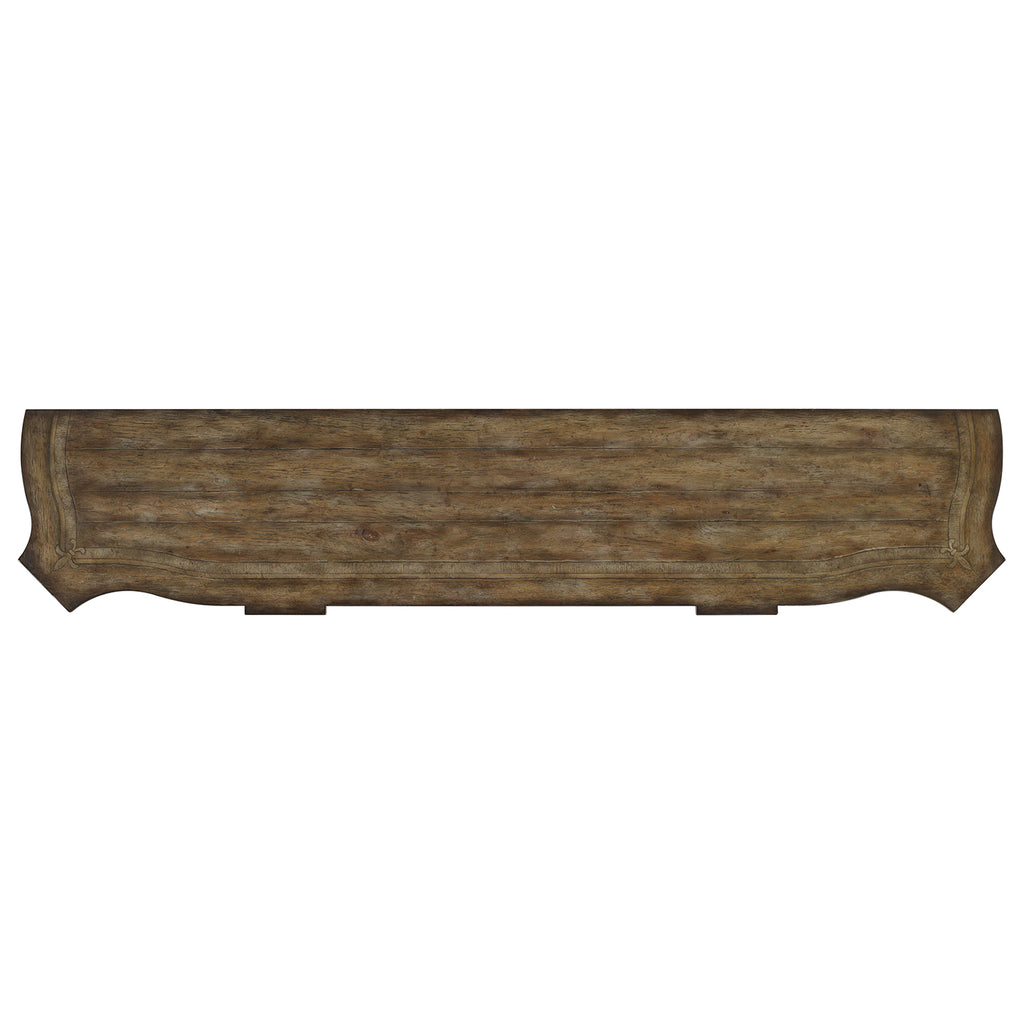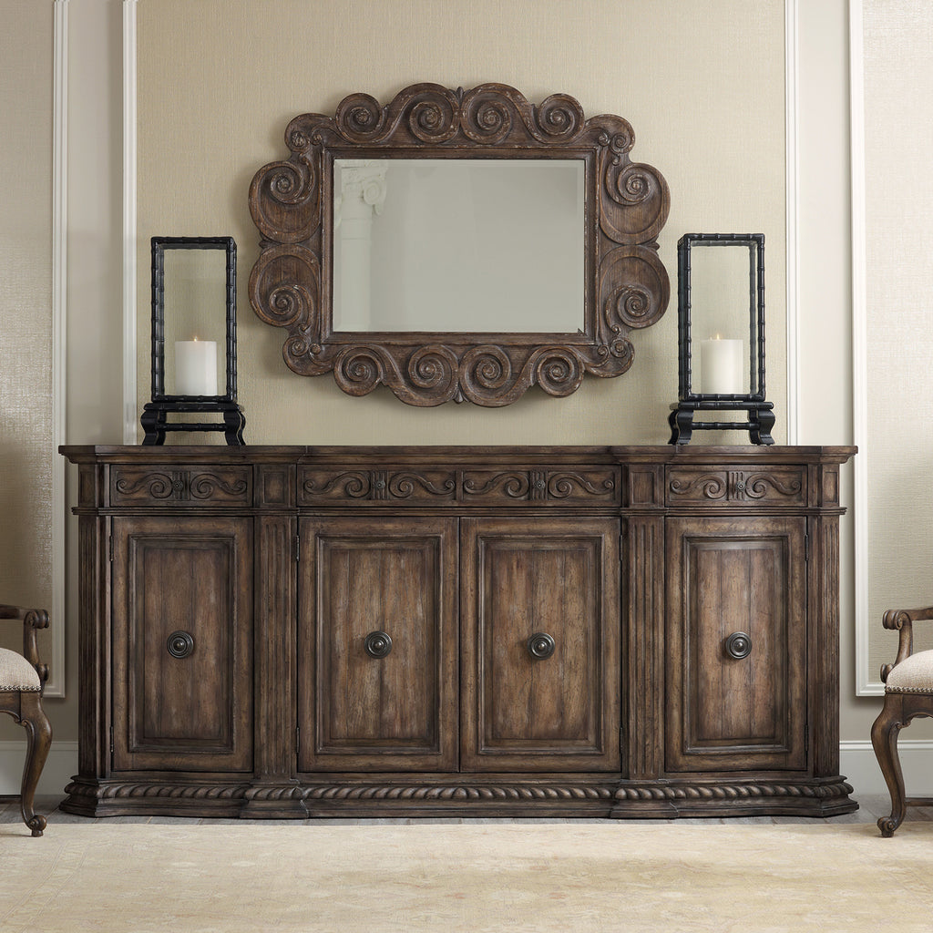 The soaring design of the grand 96-inch Rhapsody Credenza will lift your spirits and elevate the atmosphere. Romantic scroll motifs around the apron, column motifs on the case front and a rope-twist carving around the base give a classical pedigree to the piece. The walnut-colored finish inspired by the rustic nature of reclaimed woods in beautiful patinas makes the credenza fresh for today's relaxed interiors. The multi-functional credenza has three drawers and a drop-front center drawer and four doors with one adjustable wood shelf behind each and one adjustable shelf behind the center doors.