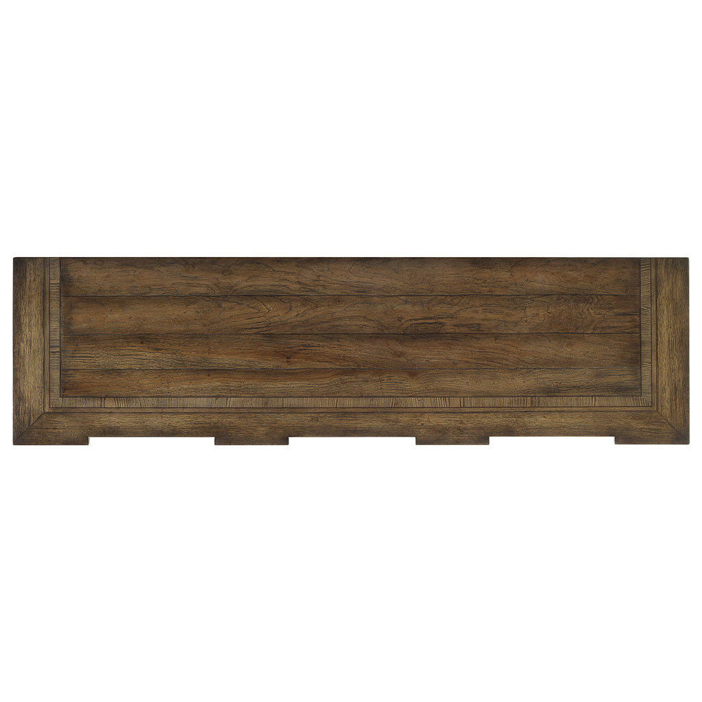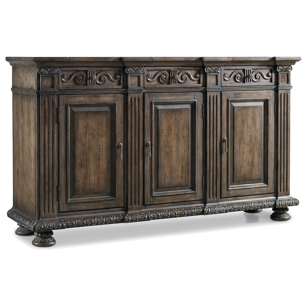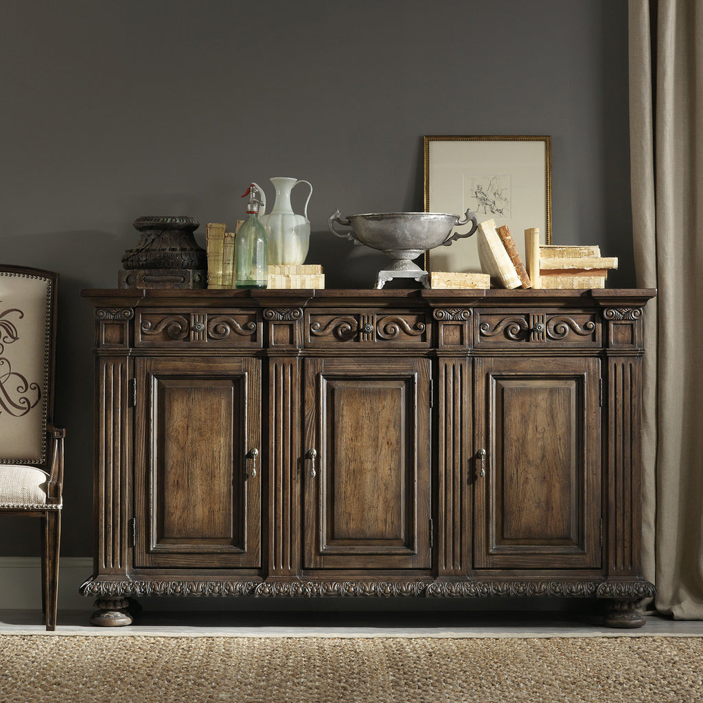 The soaring design of the Rhapsody Credenza will lift your spirits and elevate the atmosphere. Romantic scroll motifs around the apron, column motifs on the case front and an acanthus leaf carving around the base give a classical pedigree to the piece. The walnut-colored finish inspired by the rustic nature of reclaimed woods in beautiful patinas makes the credenza fresh for today's relaxed interiors. The multi-functional credenza has three drawers and a drop-front center drawer and three doors with one adjustable wood shelf behind each.