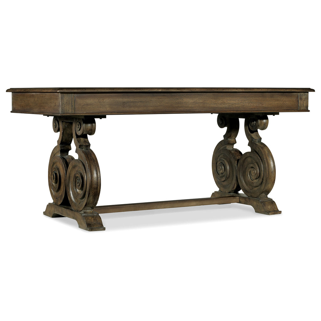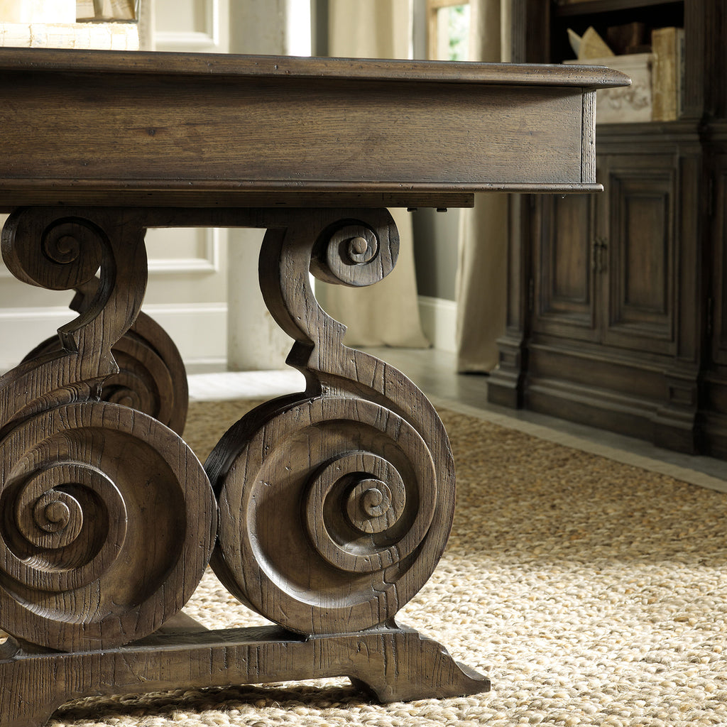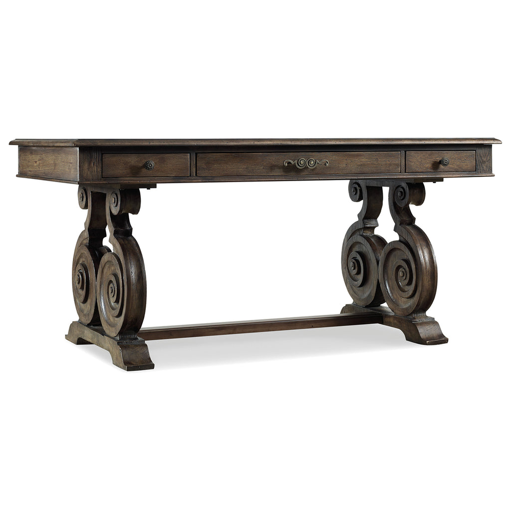 Create an inspirational work-from-home space with the exuberant design, lyre-like base and timeless motifs of the Rhapsody Writing Desk. Exuding casual opulence, the desk has a walnut-colored finish inspired by the natural yet rustic nature of reclaimed woods in natural patinas. Crafted of Pecan, Hickory, Ash, Black Walnut and Maple Veneers, the desk is as practical as it is stunning, offering a center drawer with drop-front for keyboard use, two drawers with one removable writing insert and pencil tray for use in either drawer, and 3 slots with 2 removable dividers in each drawer.
