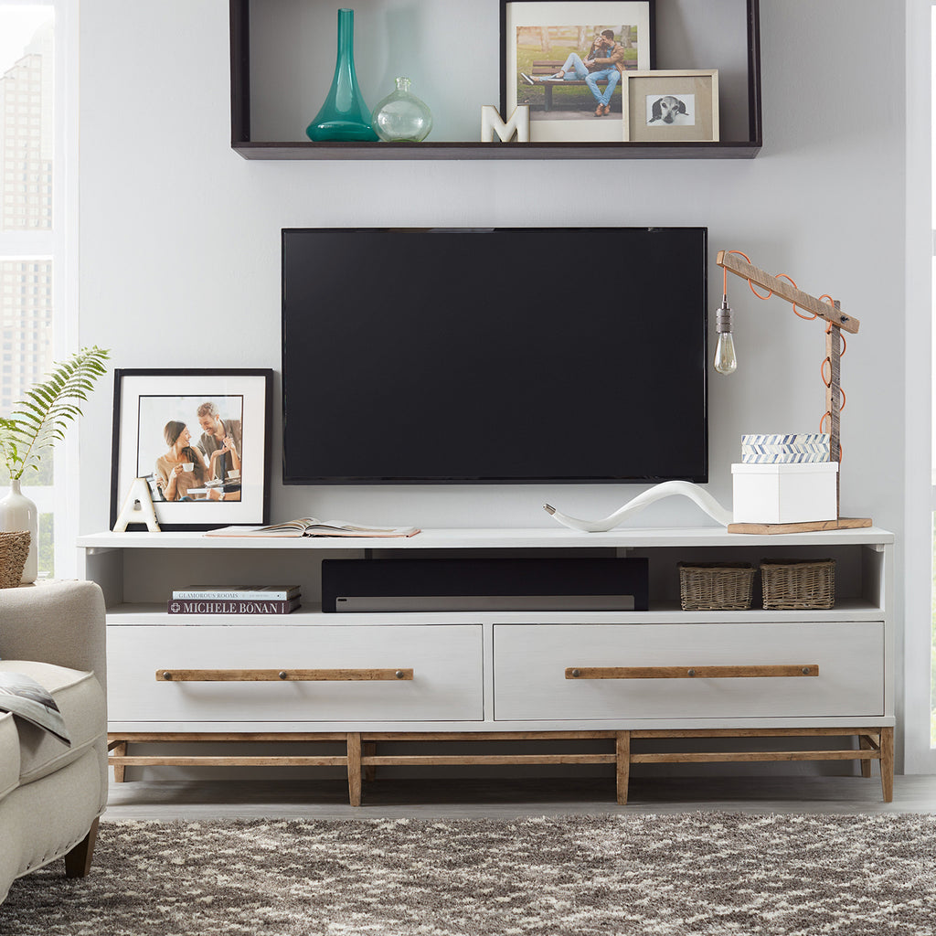 Rustic luxe and sleek, the Urban Elevation Low Entertainment Center has a White Plaster finish on Maple and White Oak Veneers, a cool contrast to the maple base and long bar pulls accented by rustic bolts. There are two drawers and a removable back panel, and media openings in the center and on the left and right sides. A channel speaker opening with two dividers. Accommodates up to an 80-inch TV.