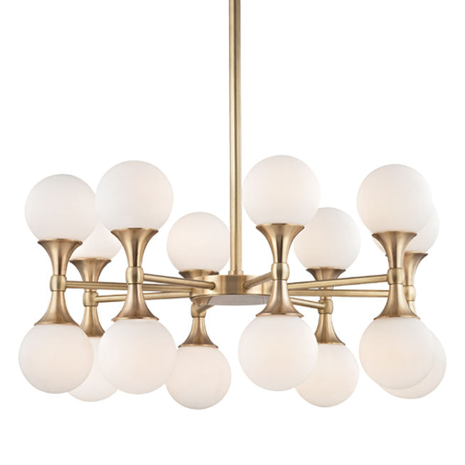 Delight in simplicity and symmetry in our Astoria family. Bubbles of light balance on and balloon forth from trumpets of cast metal. Opal-etched glass diffusers poise in balanced rows, above and below, along a wheel of light, concealing warm, dimmable LED bulbs.