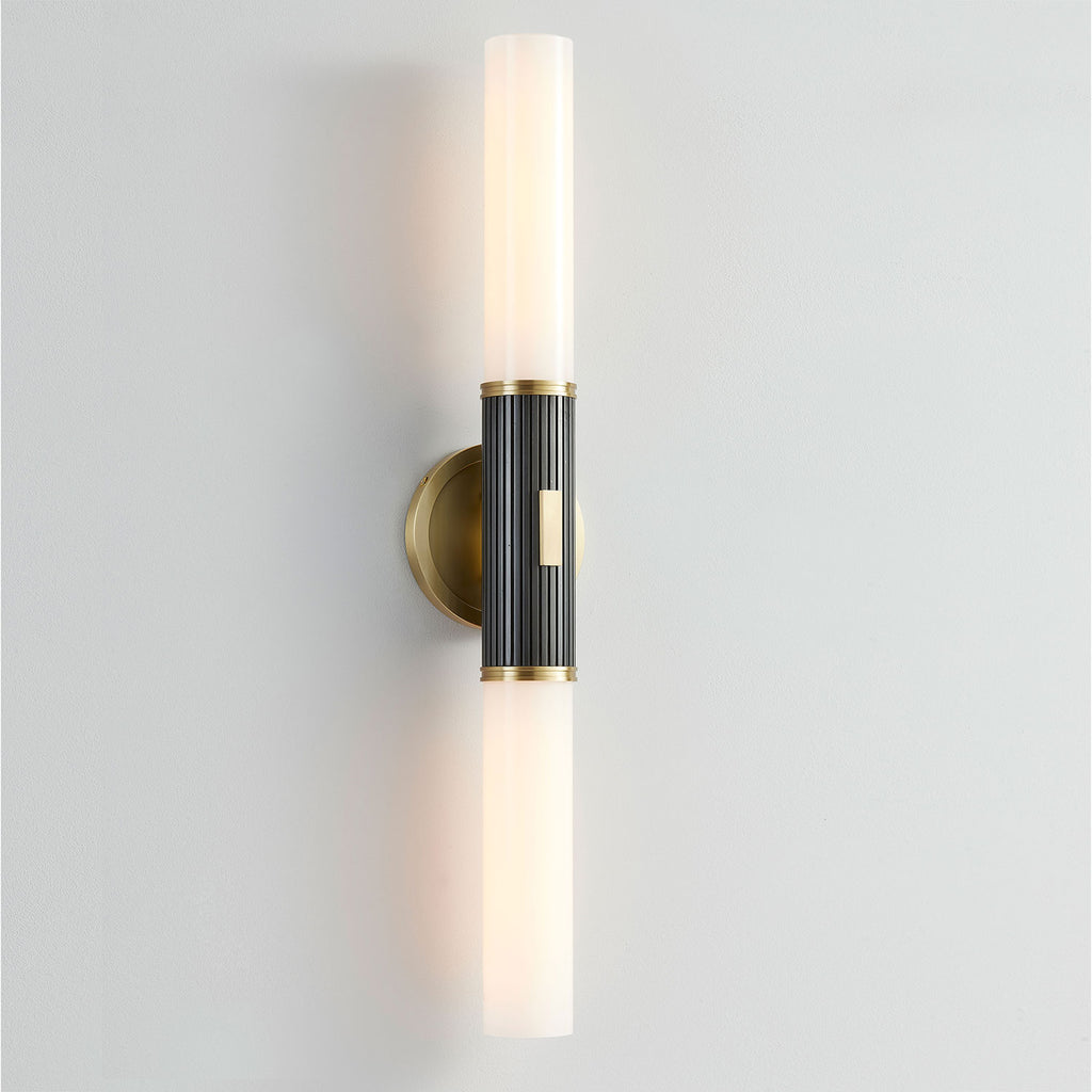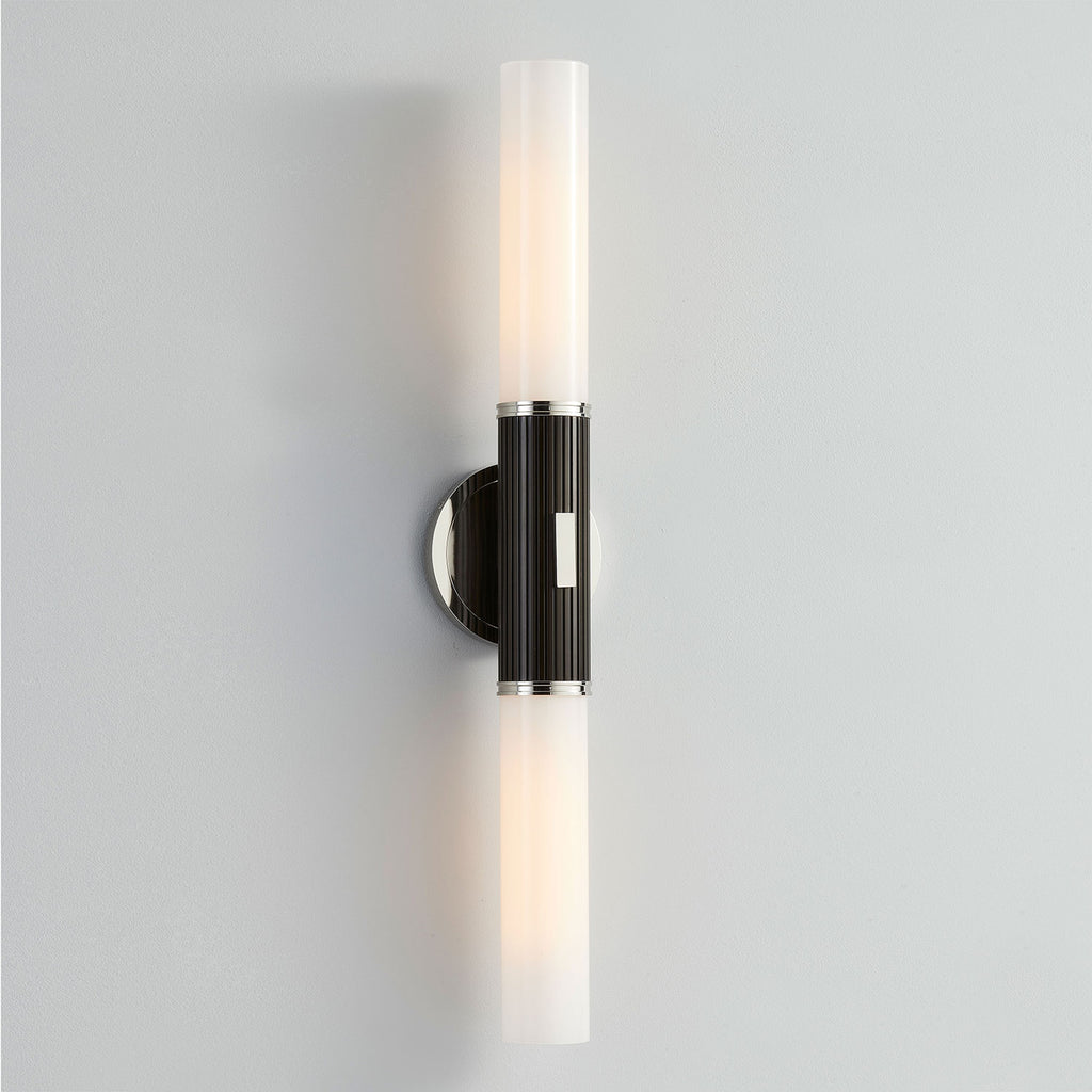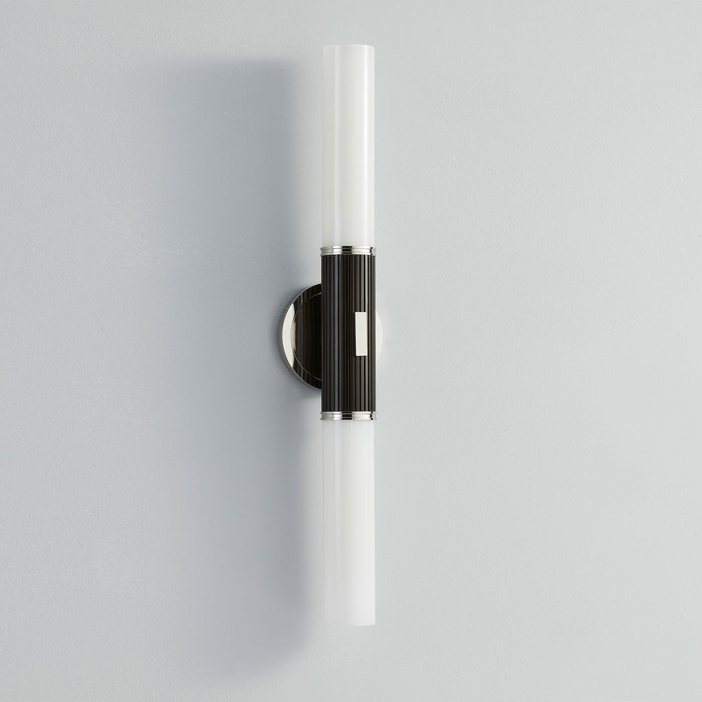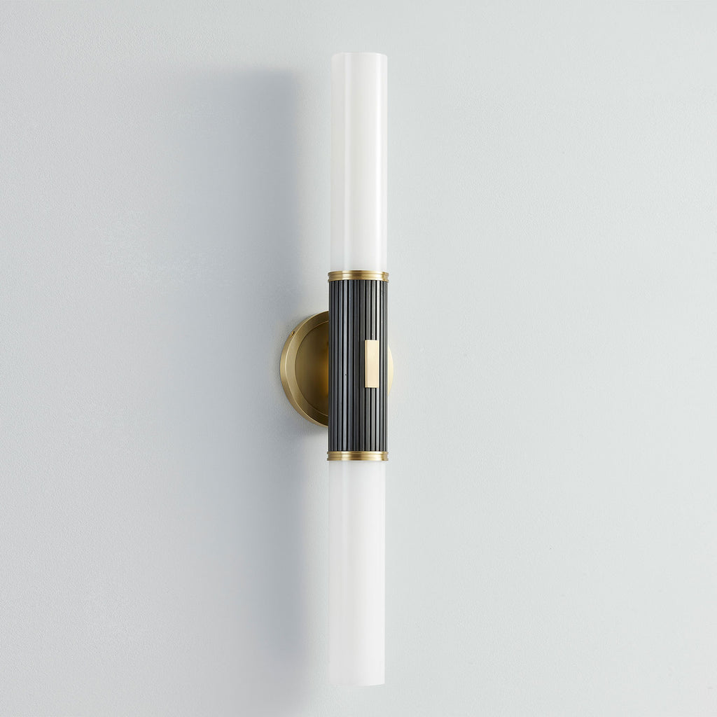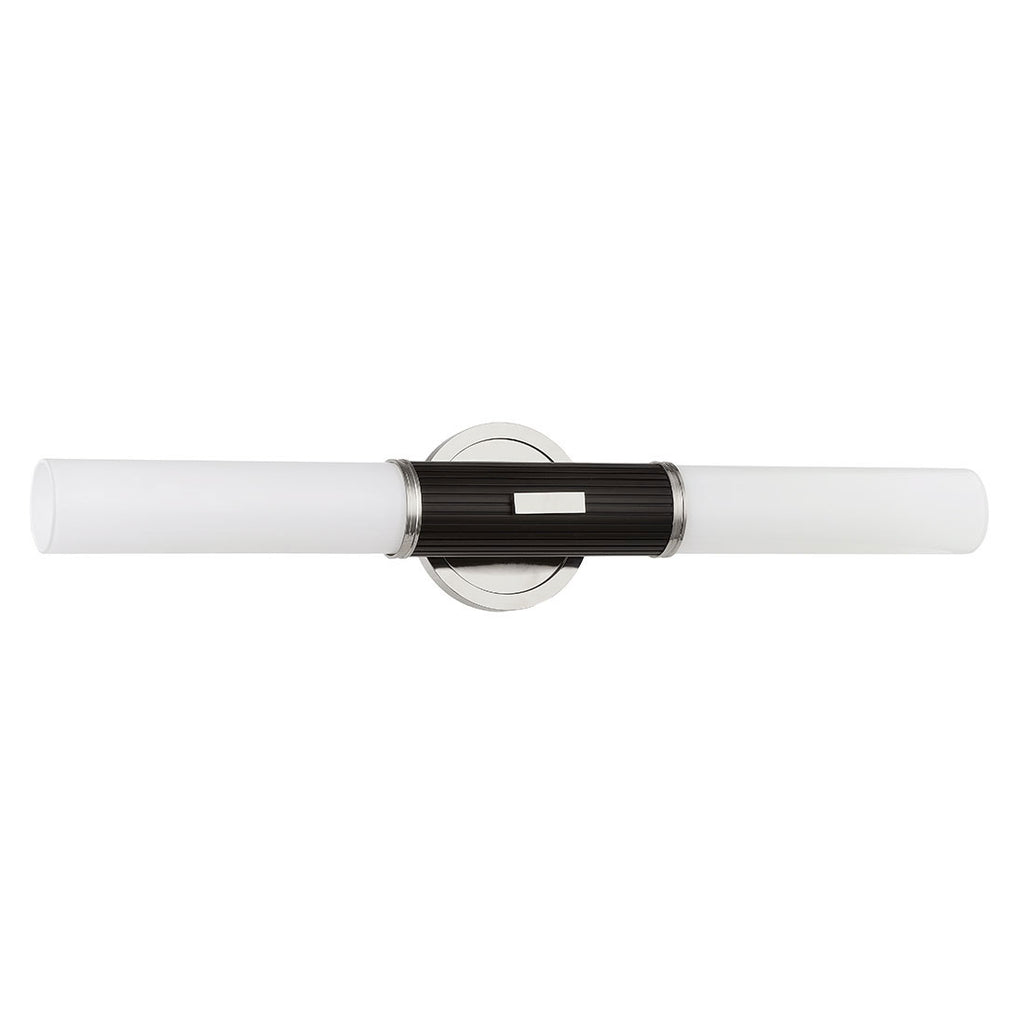 Renowned for built-to-last quality with a timeless feel, Hudson Valley offers a modern lighting collection with elegant touches, recalling vintage inspiration. The Hudson Valley Crewe wall sconce is an elevated tubular wall sconce characterized by a simple medallion style backplate, matching accents, and a contrasting fluted Black Bronze arm. Available in Aged Brass or Polished Nickel in a 1-light or 2-light sconce that doubles as a bath bar when mounted horizontally.