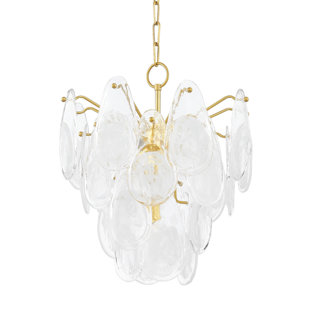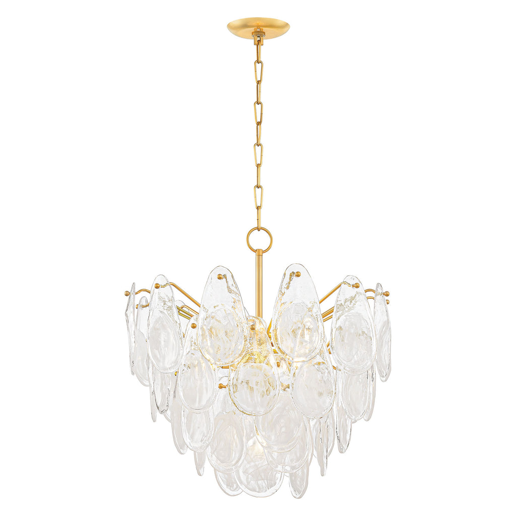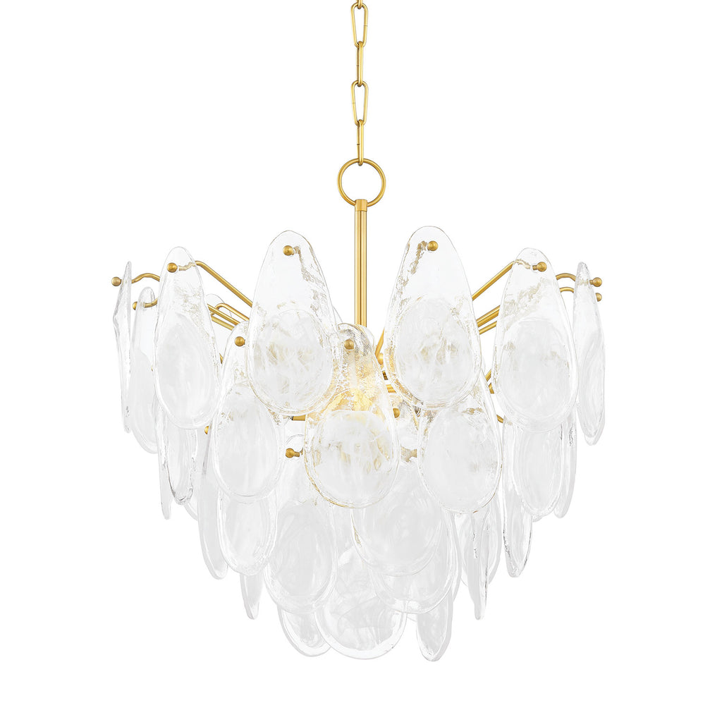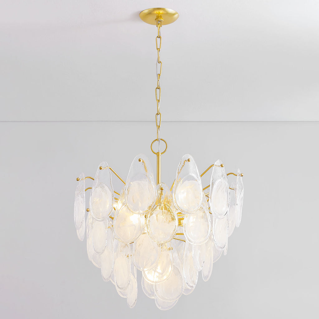Renowned for built-to-last quality with a timeless feel, Hudson Valley offers a modern lighting collection with elegant touches, recalling vintage inspiration. Smooth Blonchino Piastra glass teardrops are suspended in tiers from the waterfall-like Darcia. Reminiscent of shells or falling rain, the hand-blown glass pieces sparkle as they soften and diffuse the light. Available as a sconce, or as a chandelier in three sizes, Darcia makes a poetic and organic statement.