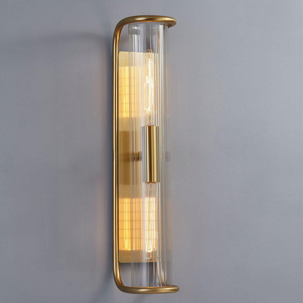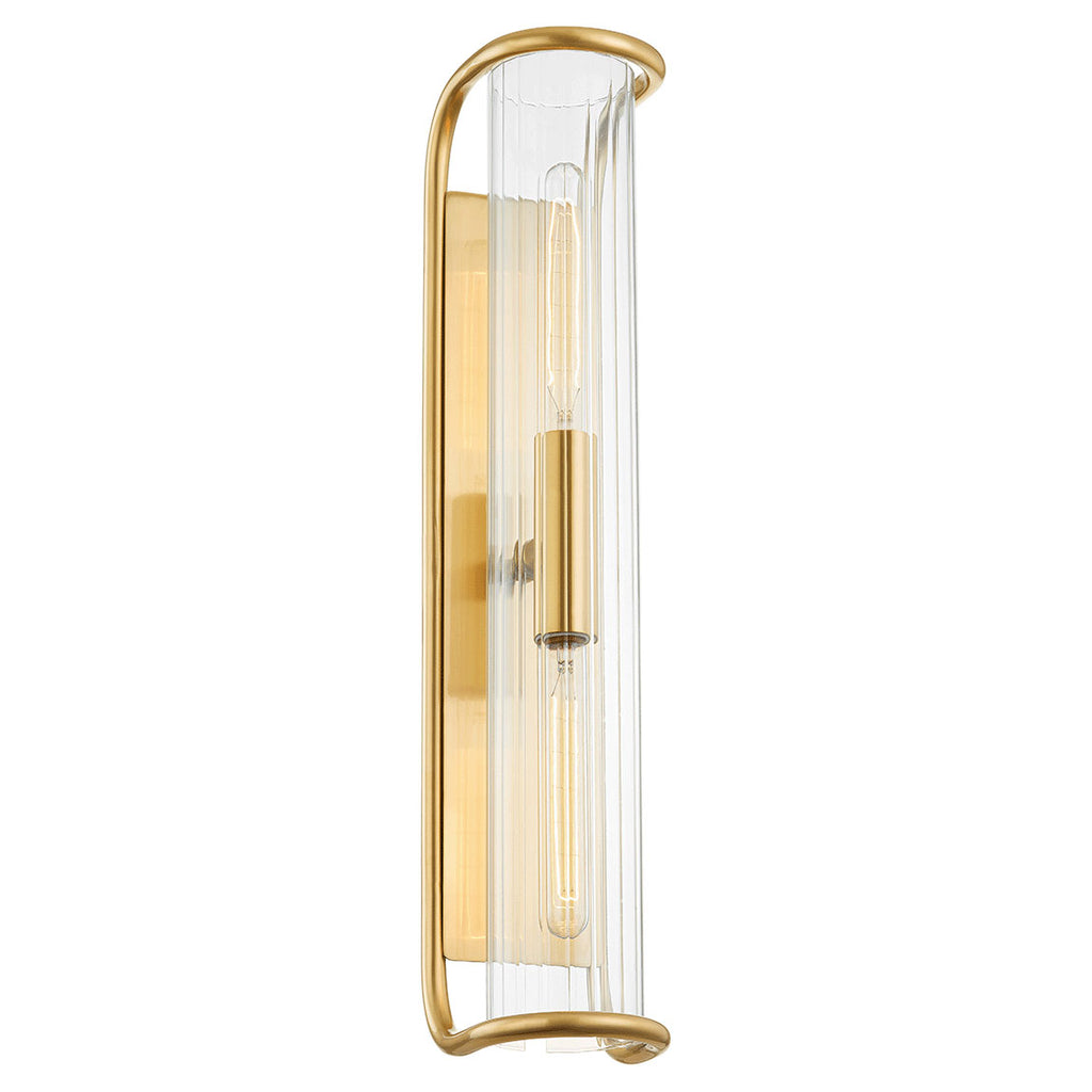 Renowned for built-to-last quality with a timeless feel, Hudson Valley offers a modern lighting collection with elegant touches, recalling vintage inspiration. The Hudson Valley Fillmore wall sconce's ribbed glass shade is beautifully framed by a smooth metal framework that curves out from the wall at either end. Light flows through the clear glass shade and reflects beautifully off the metal backplate. This 1- or 2-light sconce is another perfect addition to a bath or powder room.