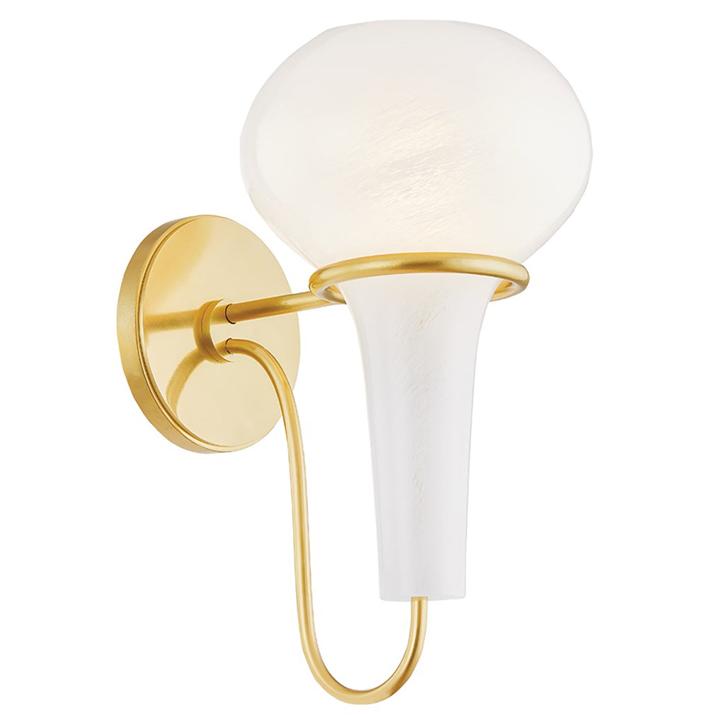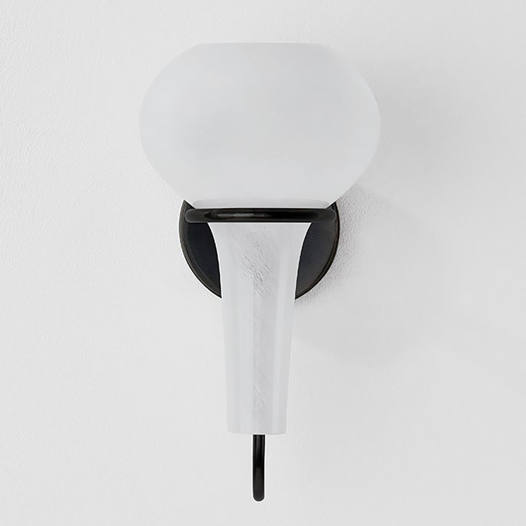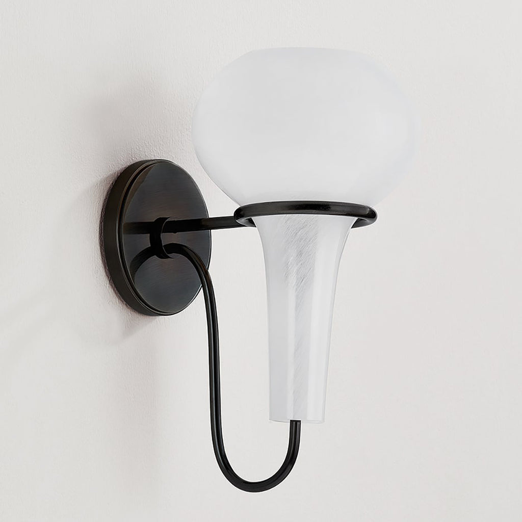 A delicate metal framework supports the upside-down, pear-shaped shade of the Hudson Valley Lighting Adams Corner sconce. Adding a surprising twist to a vintage silhouette, the swooping metal J-arm is paired with a swirled cloud glass shade. Choose from Aged Brass or Black Nickel metalwork for a more luxurious or industrial finish.
