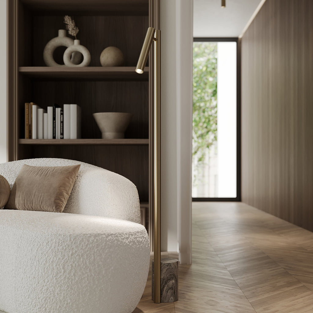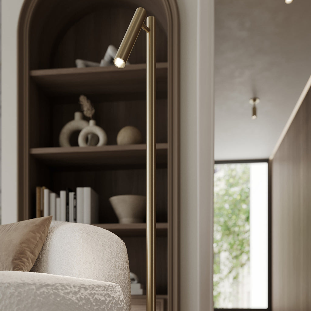 Incorporating CSL’s innovative ‘Whisper’ technology, Hudson Valley Lighting Circleville cuts a sleek figure in Aged Brass. While it might read as industrial, the elongated tube forms lean towards modernist aesthetics. The articulating shade allows precise control to create a powerful spotlight where needed. Available as a sconce and floor lamp.