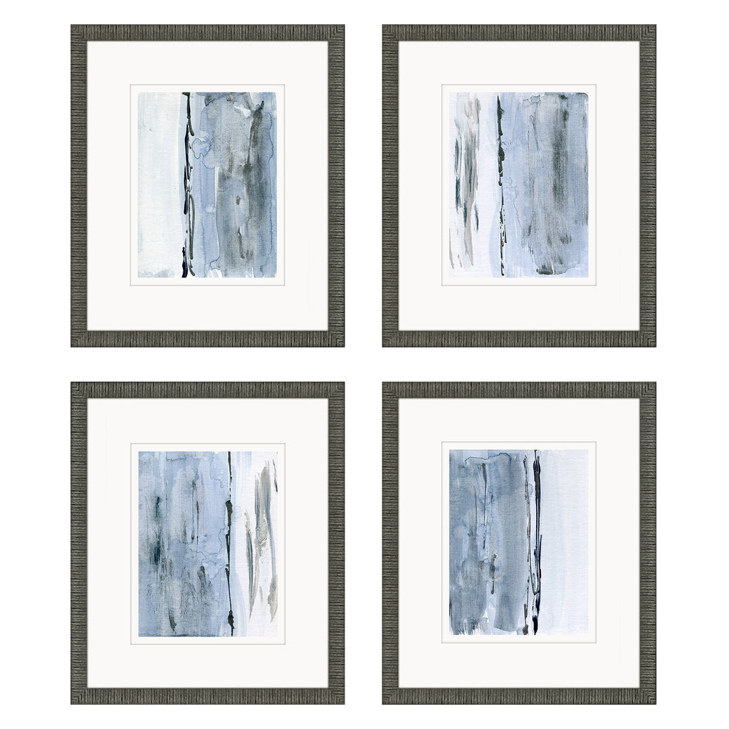 Blue abstracts are double-matted in white. Framed in a distressed black finish moulding with gray wash and black side.